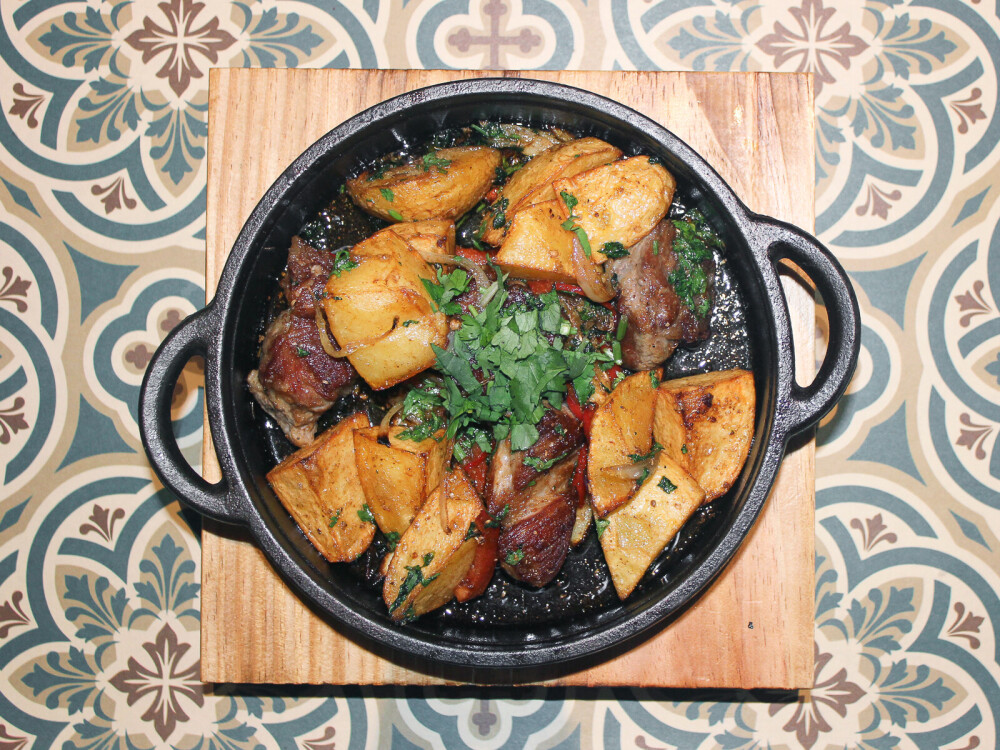 Традиционное блюдо из обжаренной свинины и картофеля с перцем, свежей зеленью, чесноком и луком
