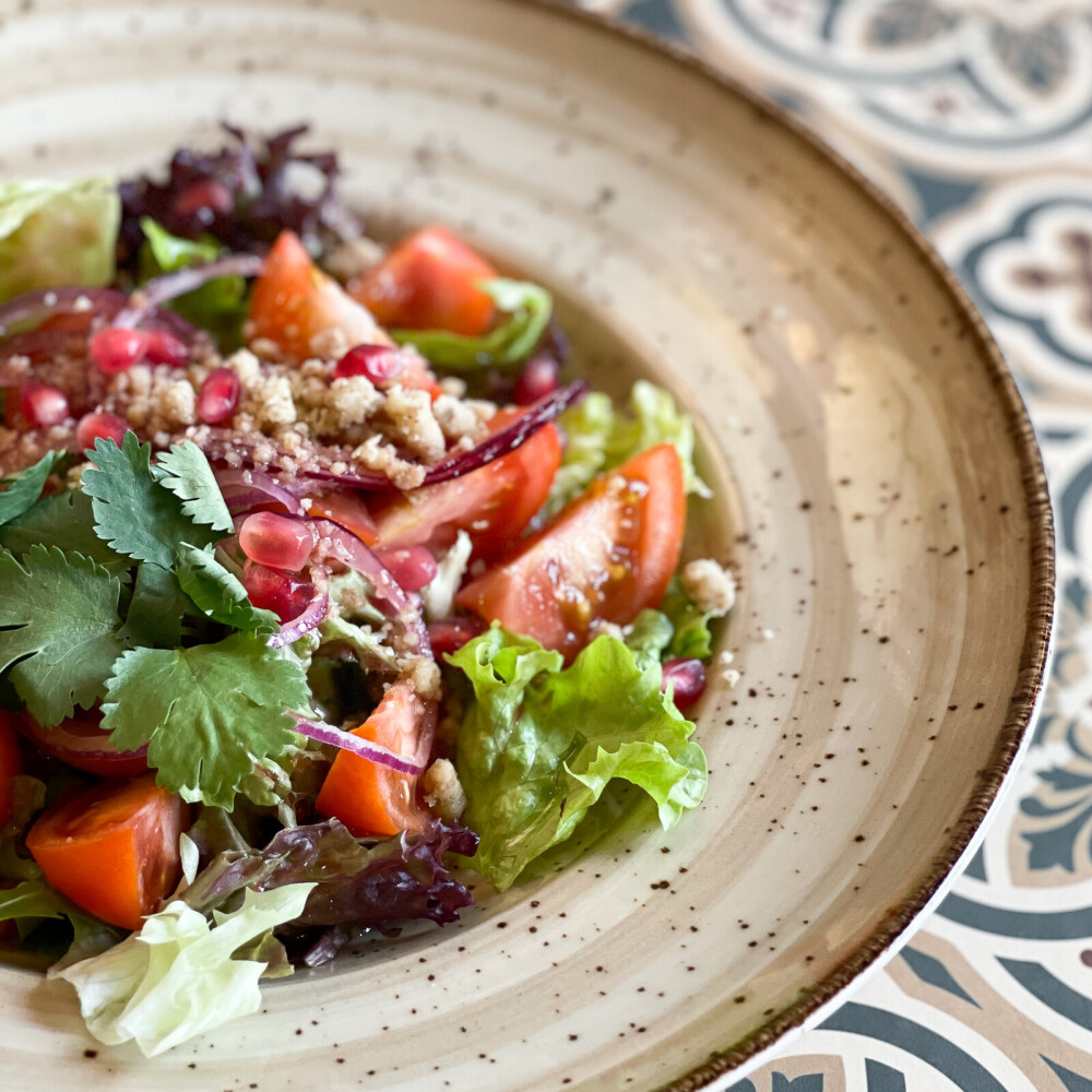 Салат,огурец, помидор, лук красный, кинза, гранатовый соус, грецкие орехи