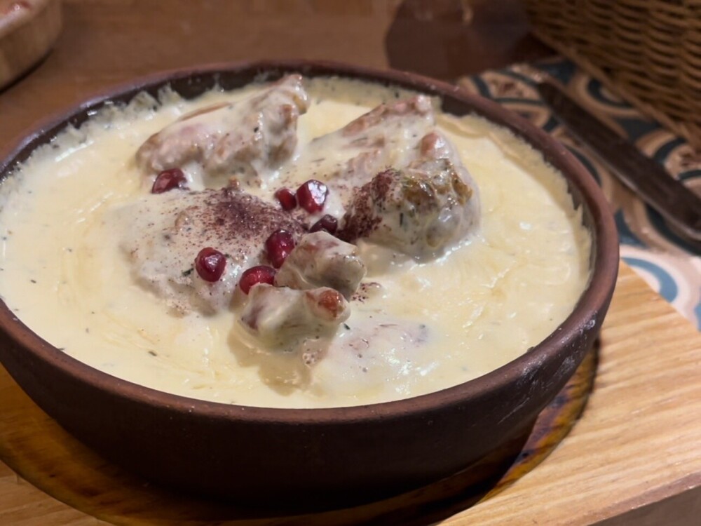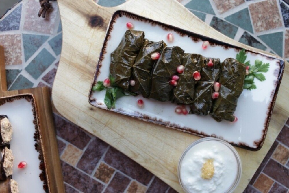 Традиционное блюдо из винoградных листьев, фаршированных мясным фаршем из говядины с зеленью и специями, подаётся с чесночным мацони