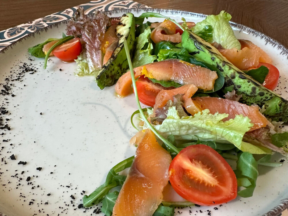 Салат с форелью и картофельными клопсами