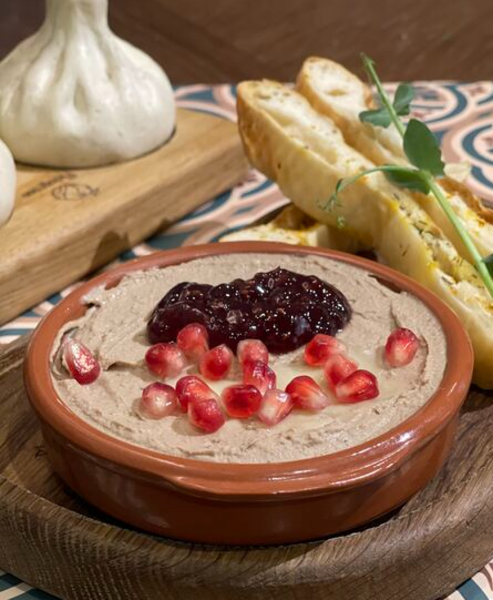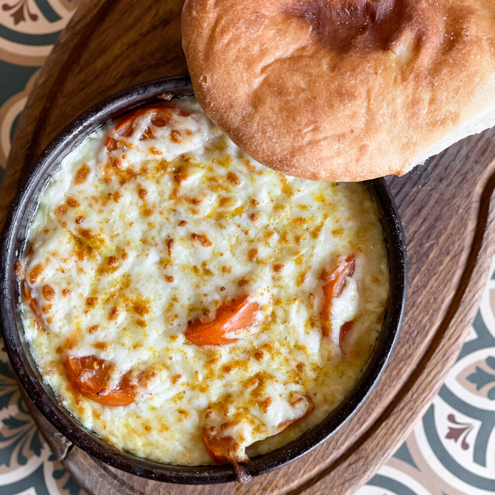 Сулугуни запекается в кеци со специями и помидорами, подаётся с «Шоти»