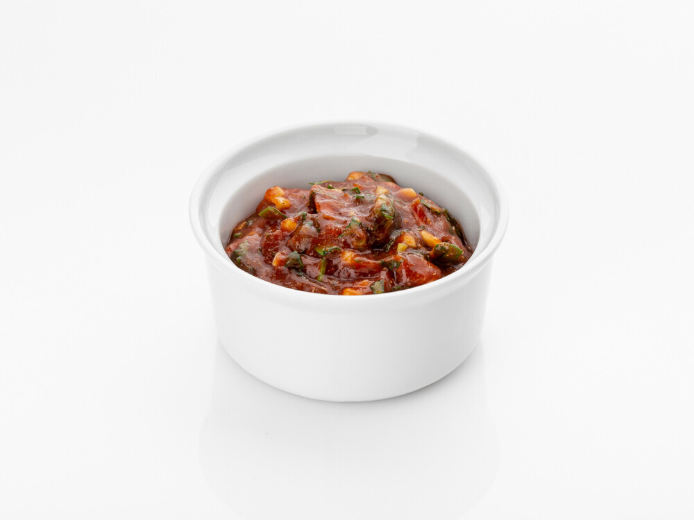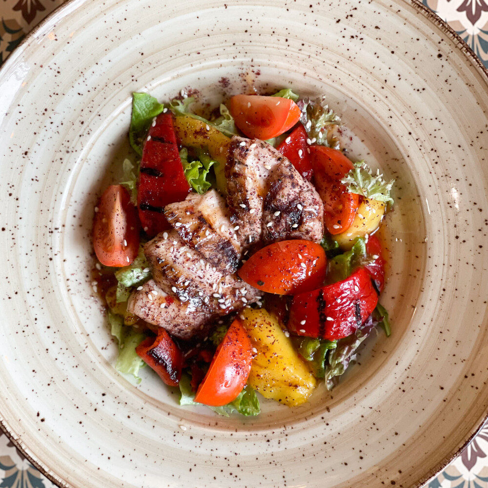 Мякоть индейки, манго, салат, черри, соус «Чили», перец печёный