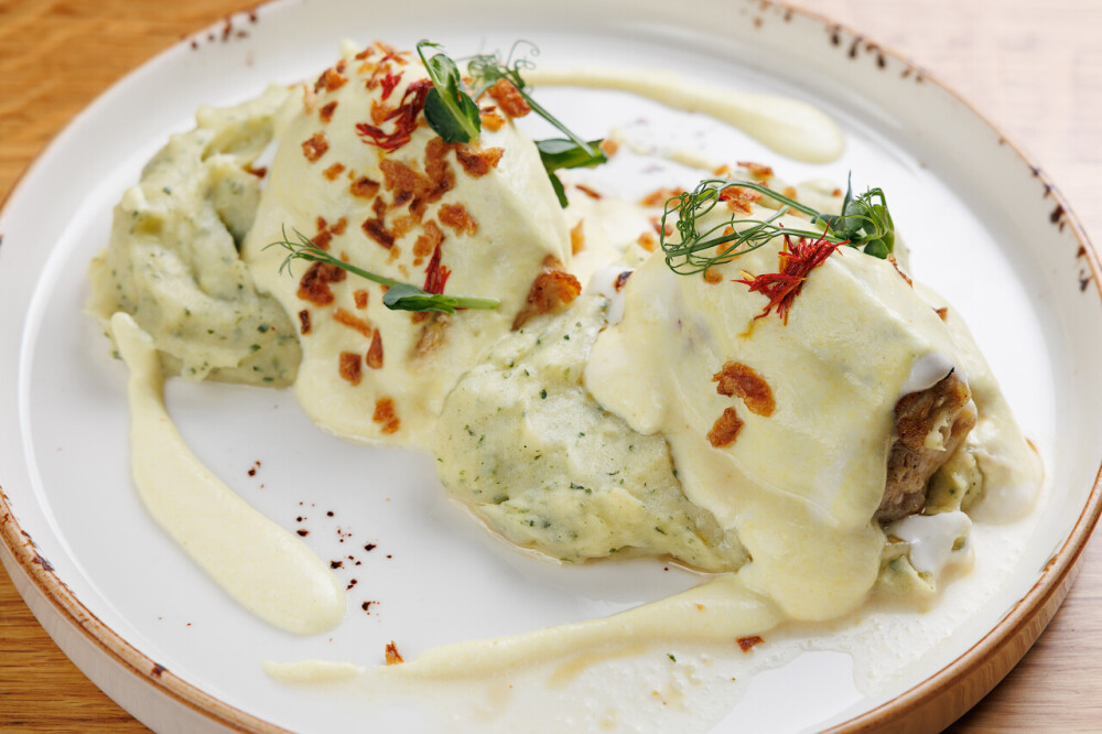 Цыпленок со шпинатным пюре под шафрановым соусом
