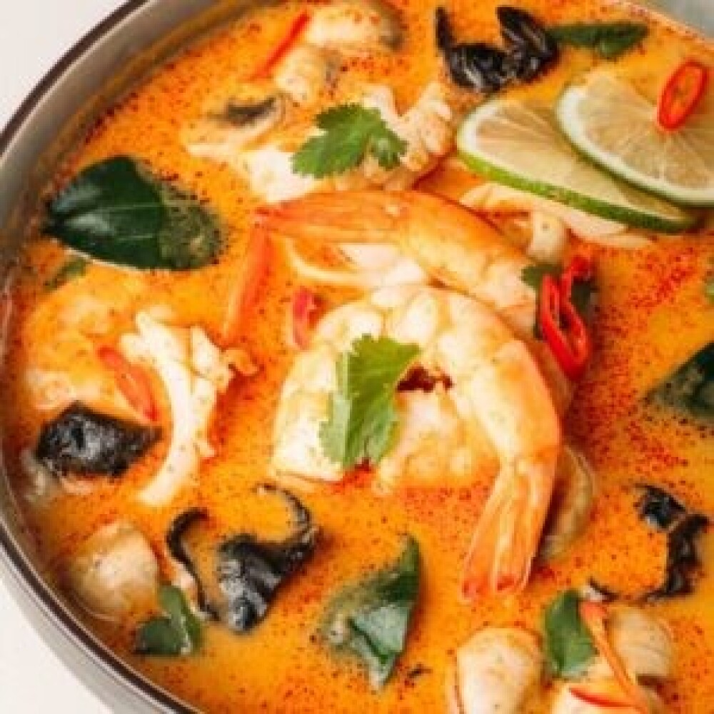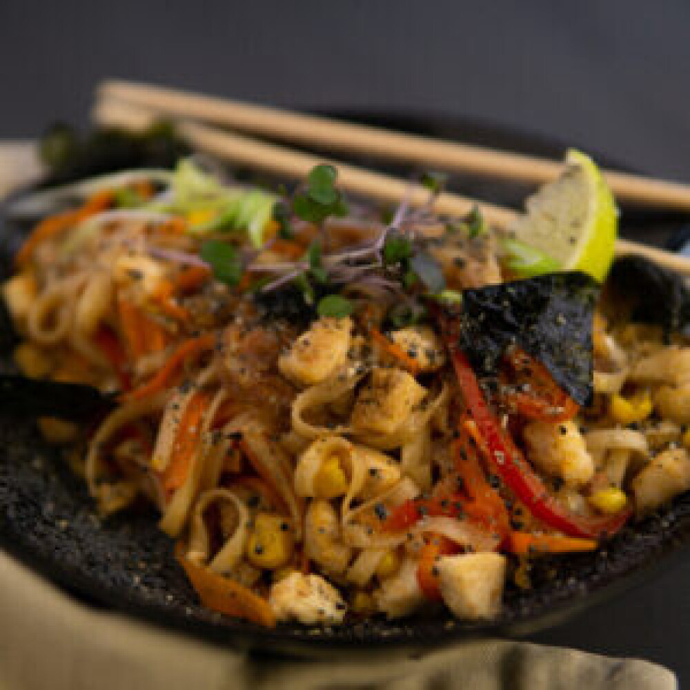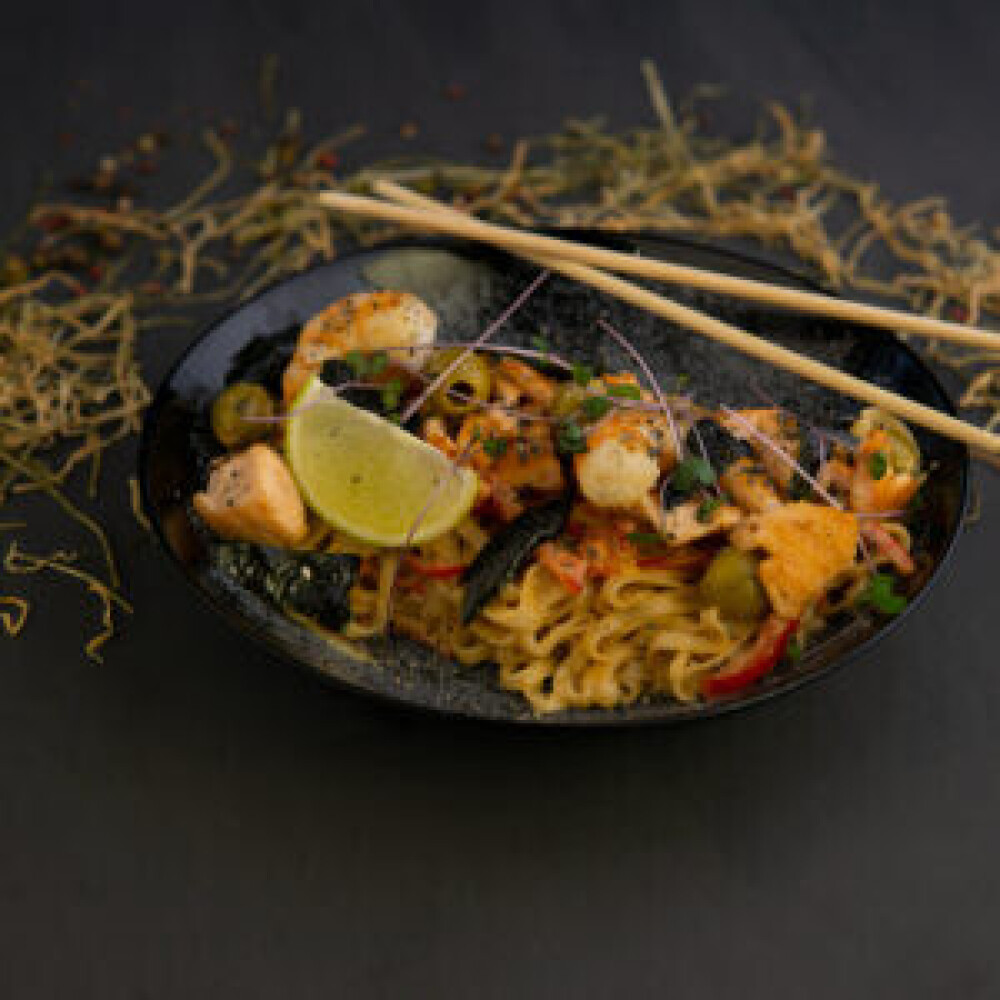 Лапша пшеничная, оливки, перец свежий, лосось, креветки, сливки, лайм, соус, нори, кунжут