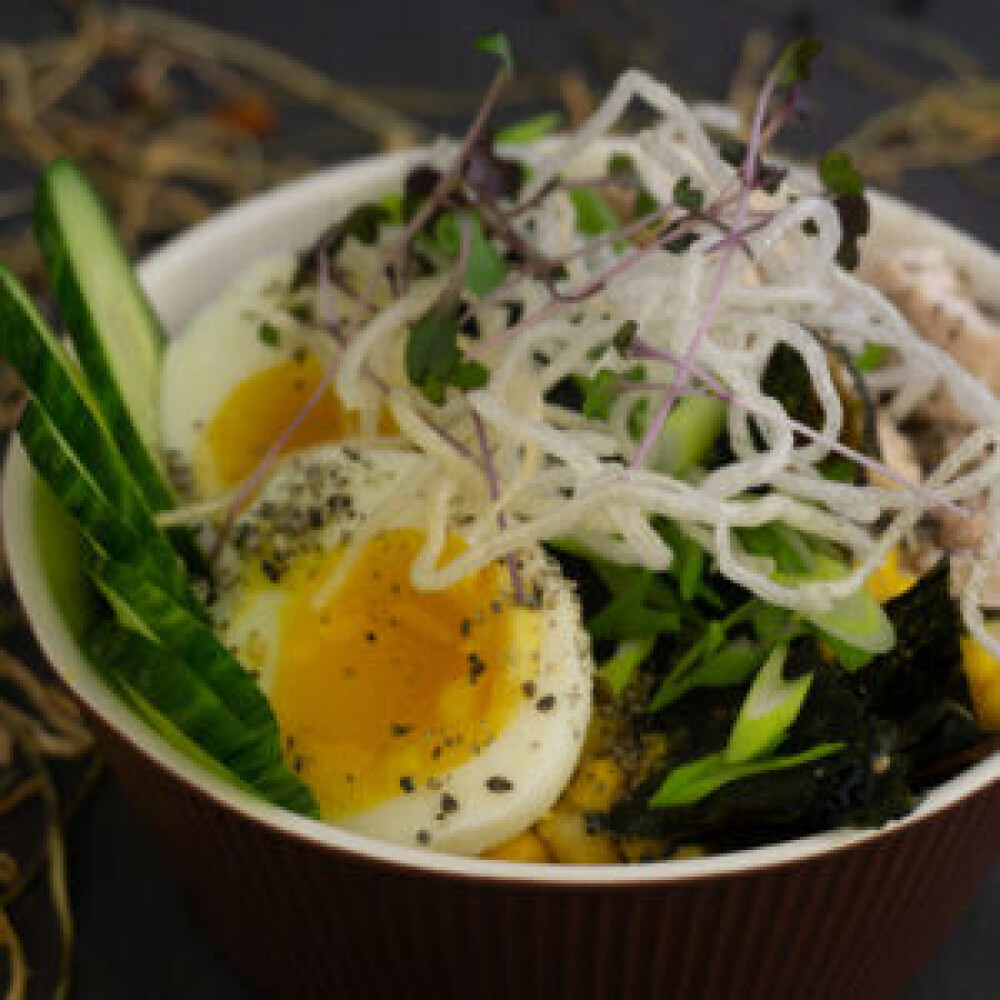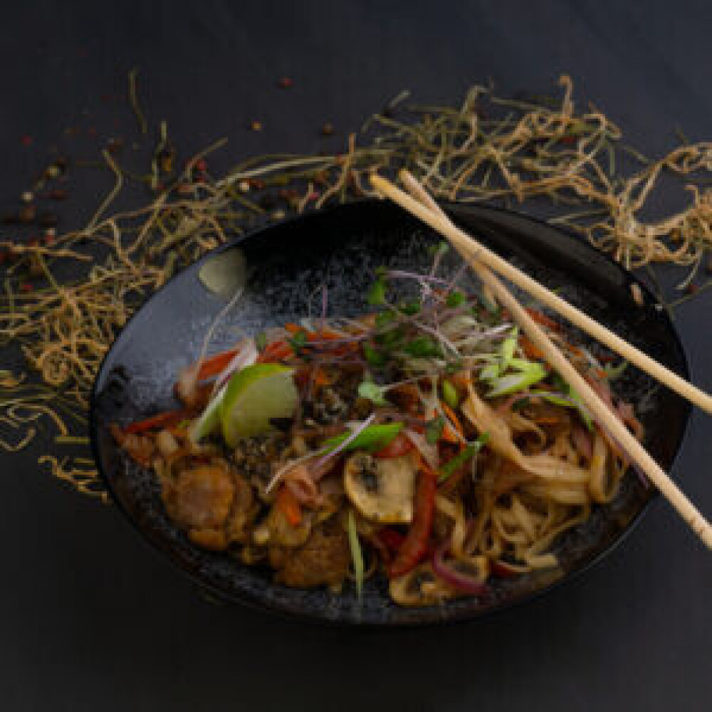 Лапша пшеничная, масло, морковь, лук репчатый, шампиньоны, кукуруза, филе, лайм, нори, кунжут, зелёный лук