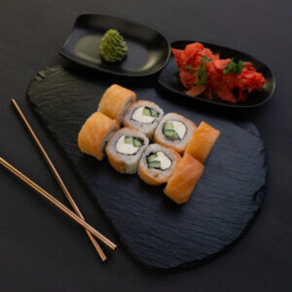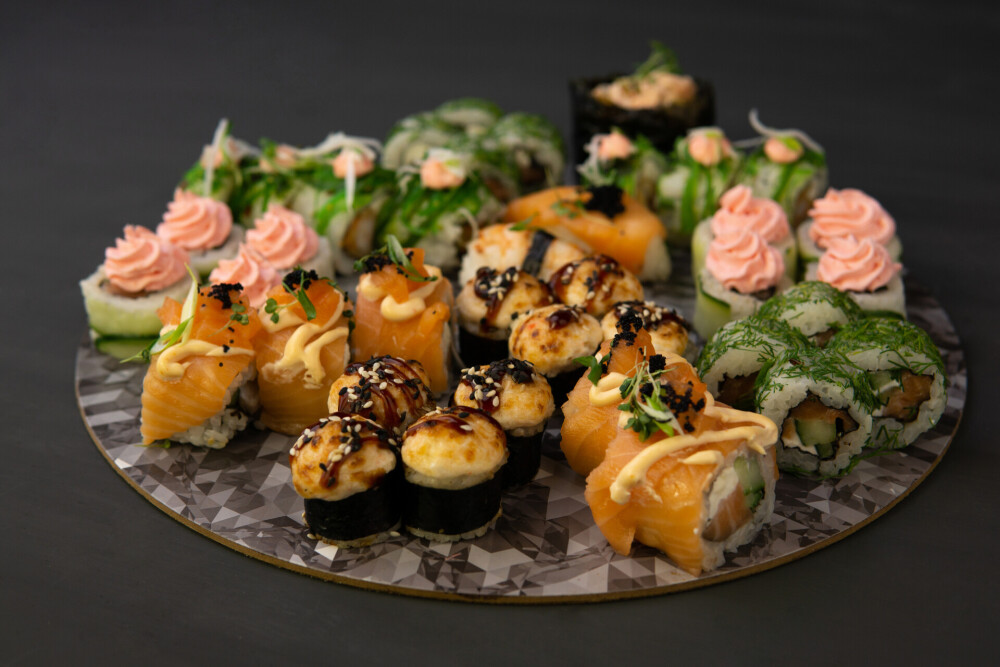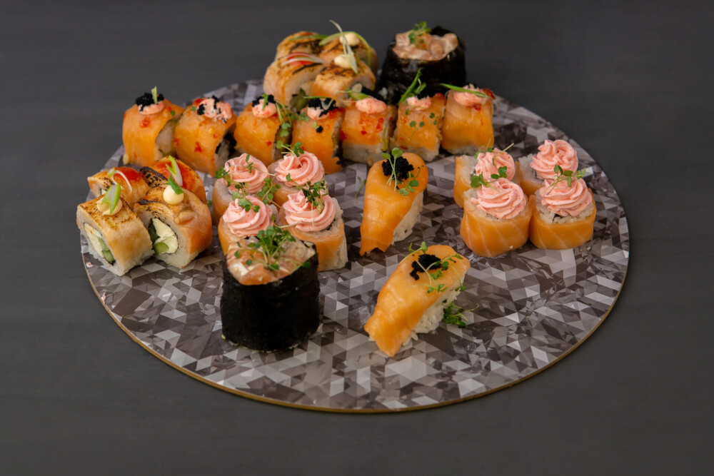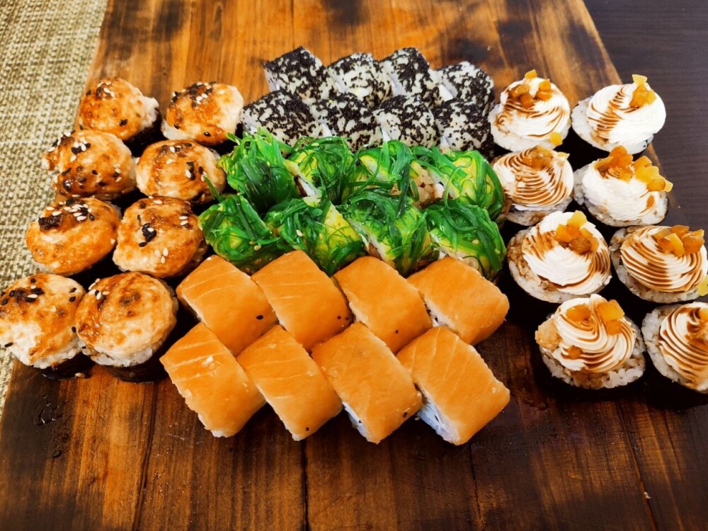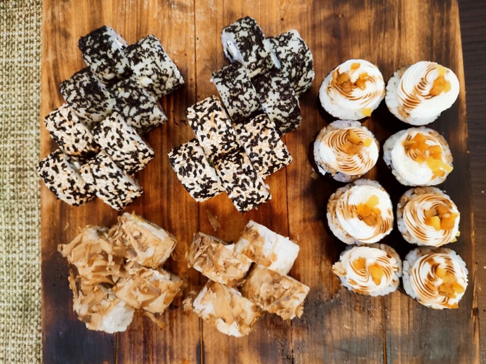 Ролл «Фила бриз авторский», ролл «Кропролл», запечённый ролл «Хенмаки» , ролл «Сарада лайт авторский», ролл «Сливочный грин», нигири «Лосось», нигири «Креветка», гункан «Лосось»