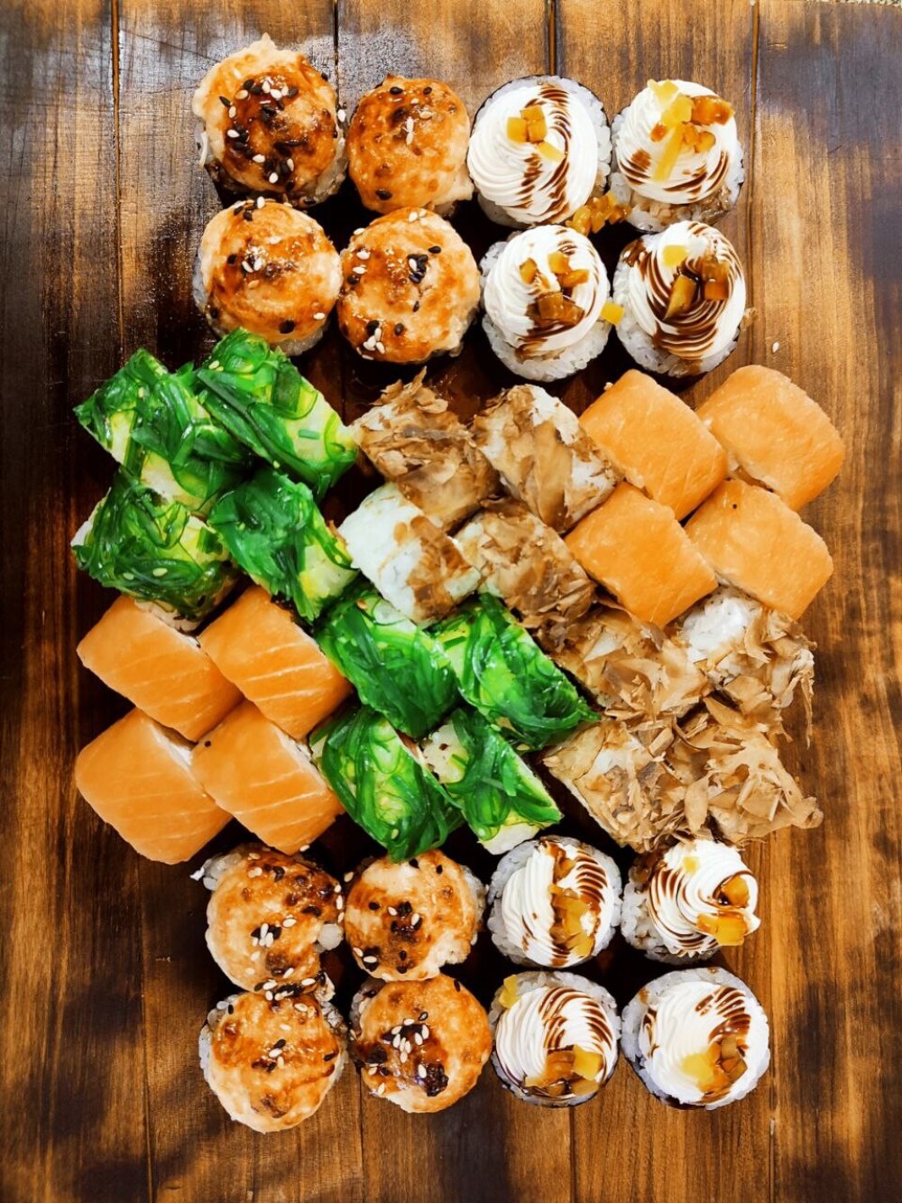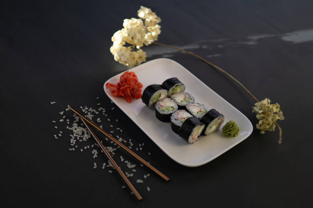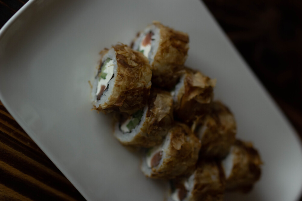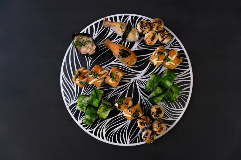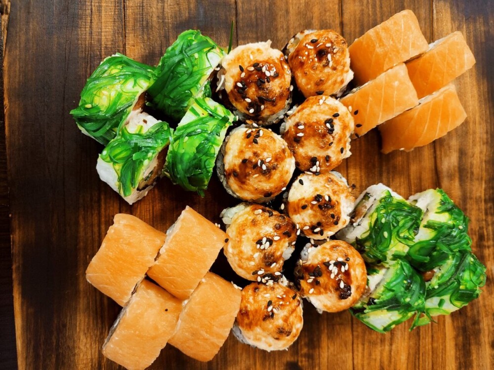 Ролл «Фила бриз авторский», ролл «Кропролл», запечённый ролл «Хенмаки» , ролл «Сарада лайт авторский», ролл «Сливочный грин», нигири «Лосось», нигири «Креветка», гункан «Лосось»