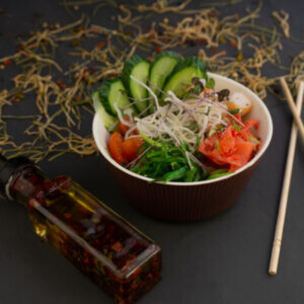 Рис, соус, лосось, огурец свежий, чука сарада, имбирь, черри, редис, лайм, кунжут, лук перья, нори
