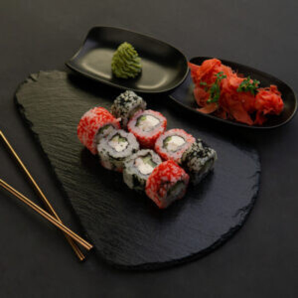 Запечённый ролл «Краб маки», ролл «Сливочный маки лосось», ролл «Калифорния», ролл «Чука лосось», ролл «Филадельфия»