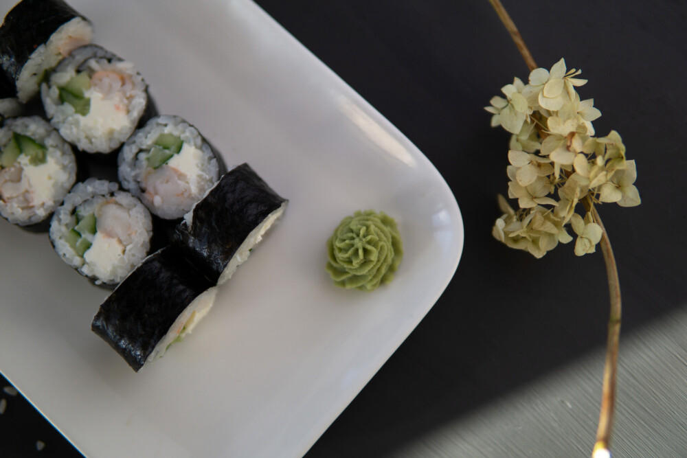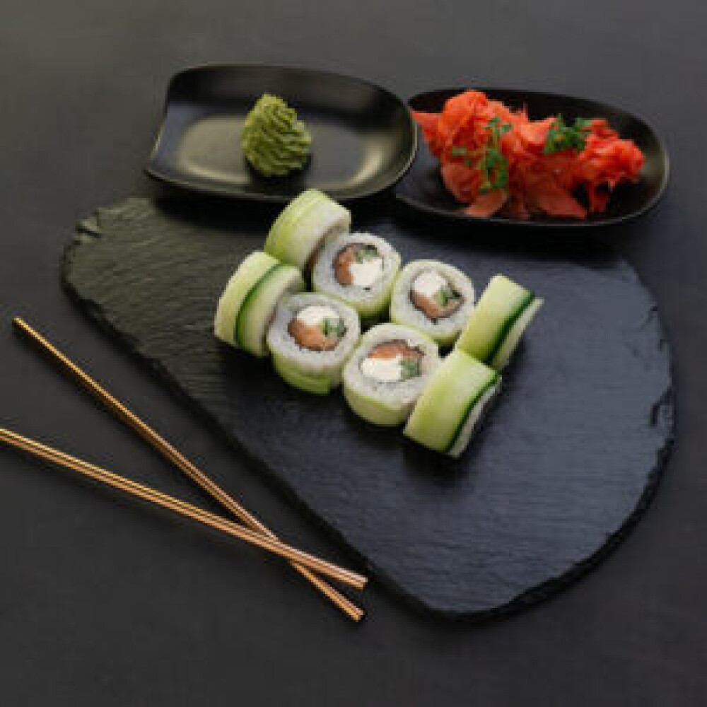 Рис, нори, сыр, лосось, огурец, соус «Шрирача»
