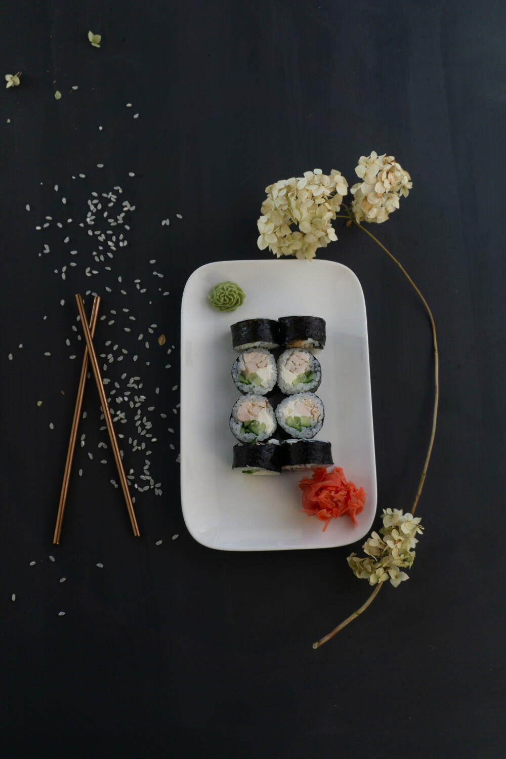 Рис, нори, огурец, курица, кунжут
