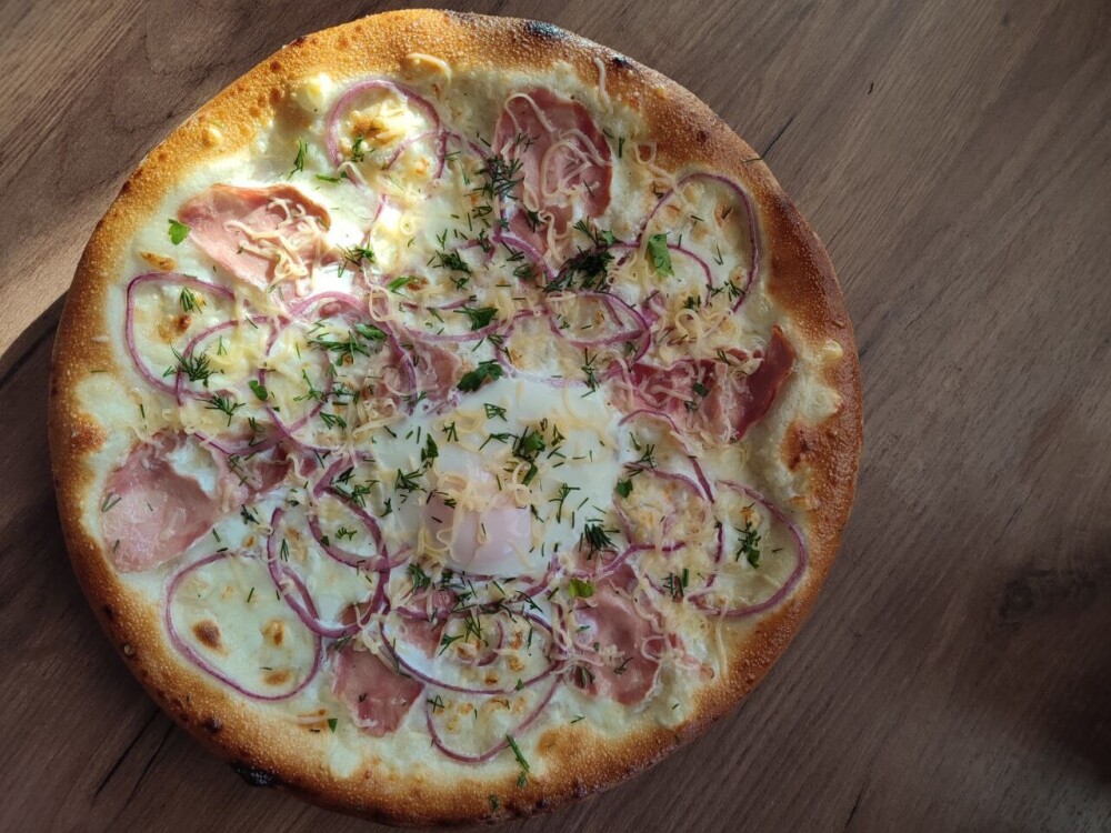 Помидоры, сыр «Моцарелла», сливки, ветчина, лук маринованный, яйцо, сыр «Пармезан», укроп, базилик