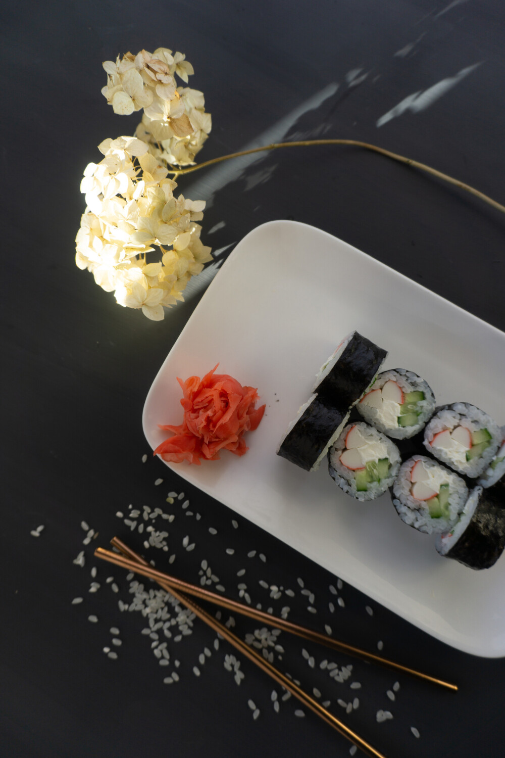 Рис, нори, сыр, огурец, лосось, стружка тунца