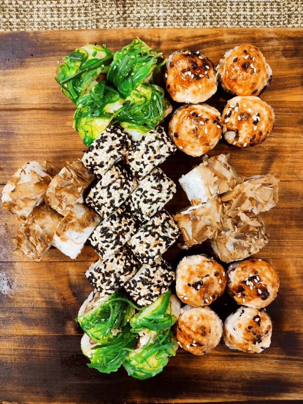 Запечённый ролл «Краб маки», ролл «Hen», ролл «Фила бонито», ролл «Чука лосось»