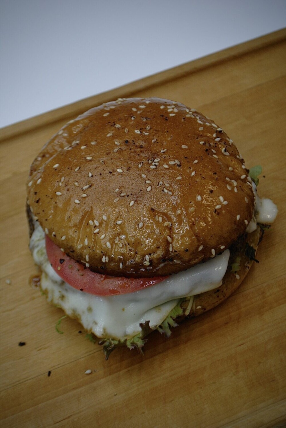 Котлета куриная, сыр «Чеддер», сыр «Моцарелла», масло сливочное с зеленью, помидоры, соус «Горчичный», соус «бургер», микс салата.