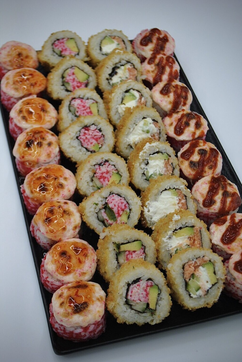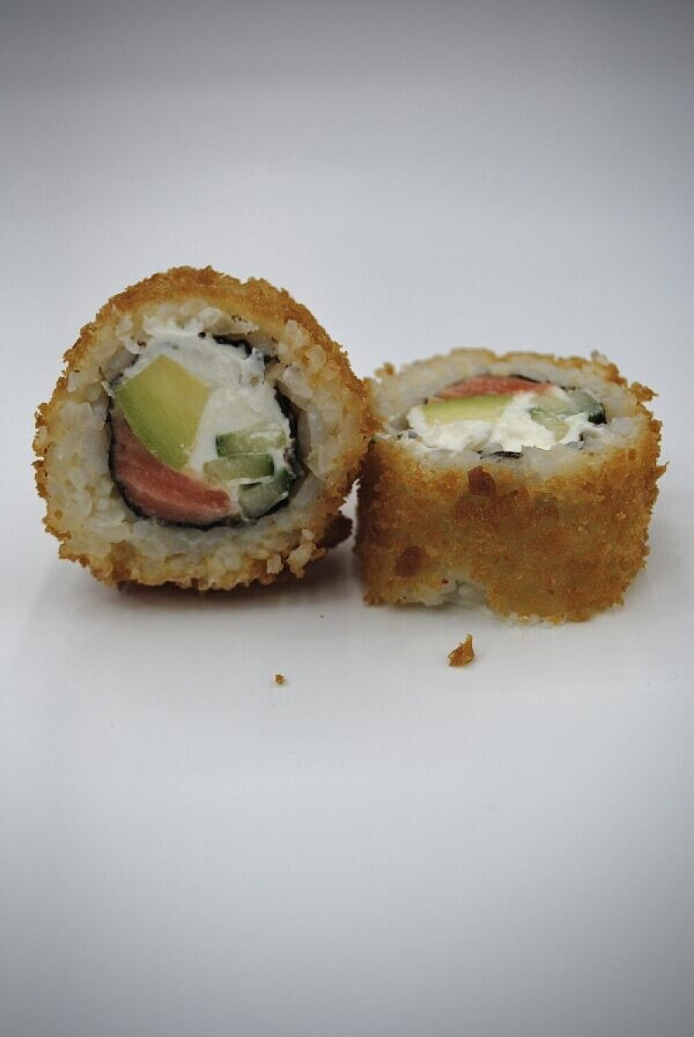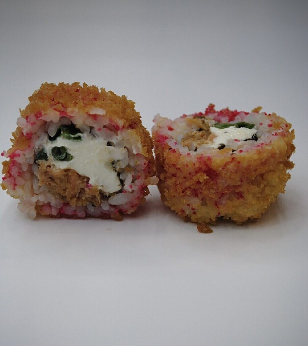 Ролл «Филадельфия фрай» (Творожный сыр, авокадо, огурец свежий, лосось свежий, темпурная смесь) ролл «Калифорния фрай» (Снежный краб, огурец свежий, авокадо, майонез, икра «Тобико», темпурная панировка), Ролл запеченный с креветкой (Сыр творожный, перец сладкий, креветка отварная, сырная шапка, соус «Чили сладкий», икра тобика), Ролл запеченный со свежим лососем (Сыр творожный, икра тобика, огурец свежий, лосось свежий, сырная шапка, соус «Кимчи»)