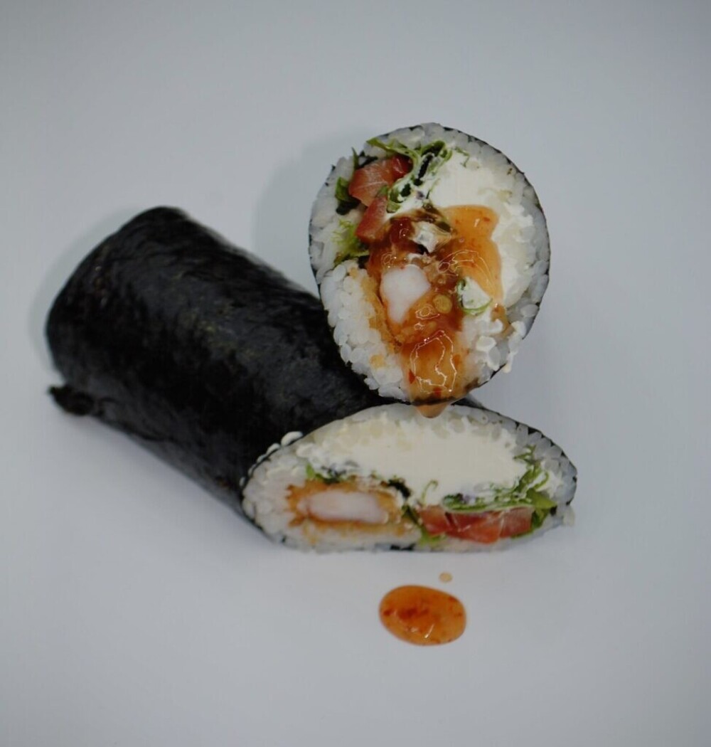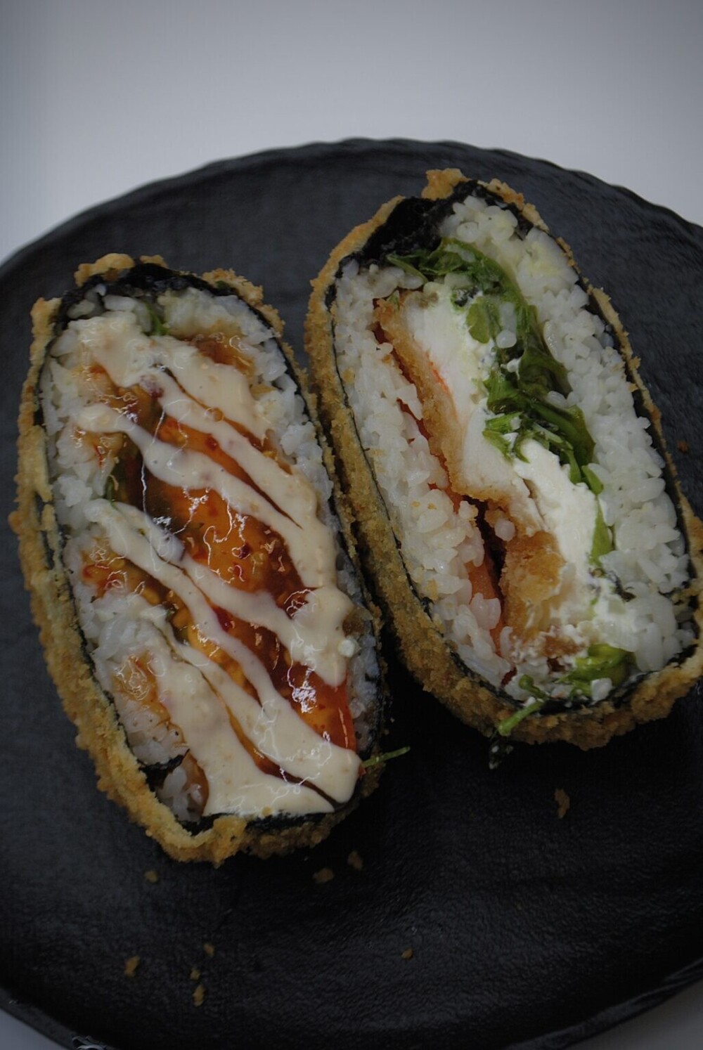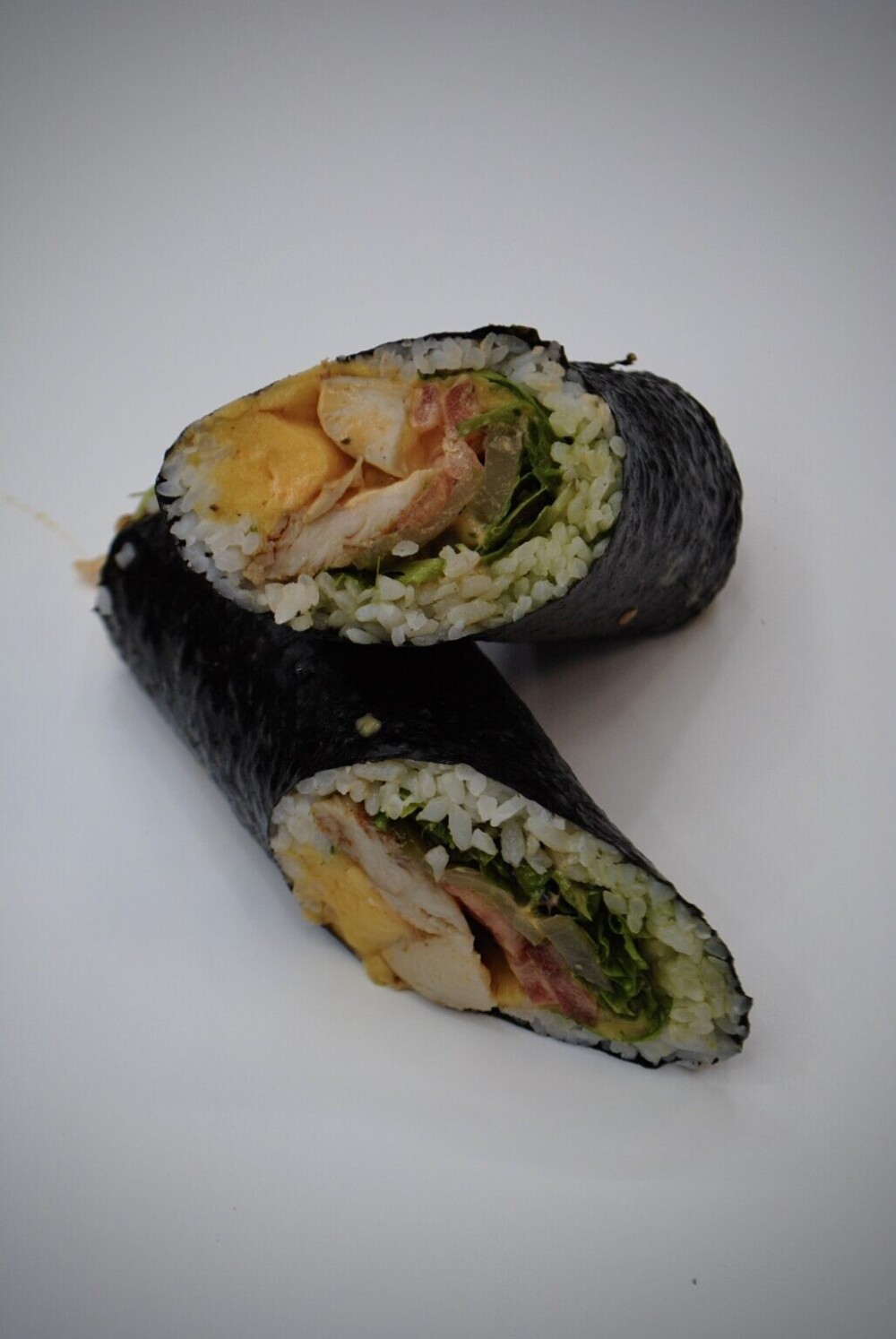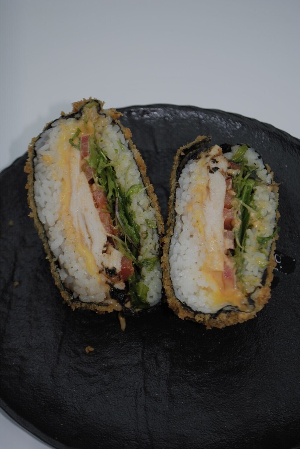 Рис, водоросли «Нори», микс салата, соус «Зеленый», помидоры, цыпленок «Су-вид», сыр «Чеддер», сыр «Моцарелла», соус «Бургер», панировка «Темпура»
