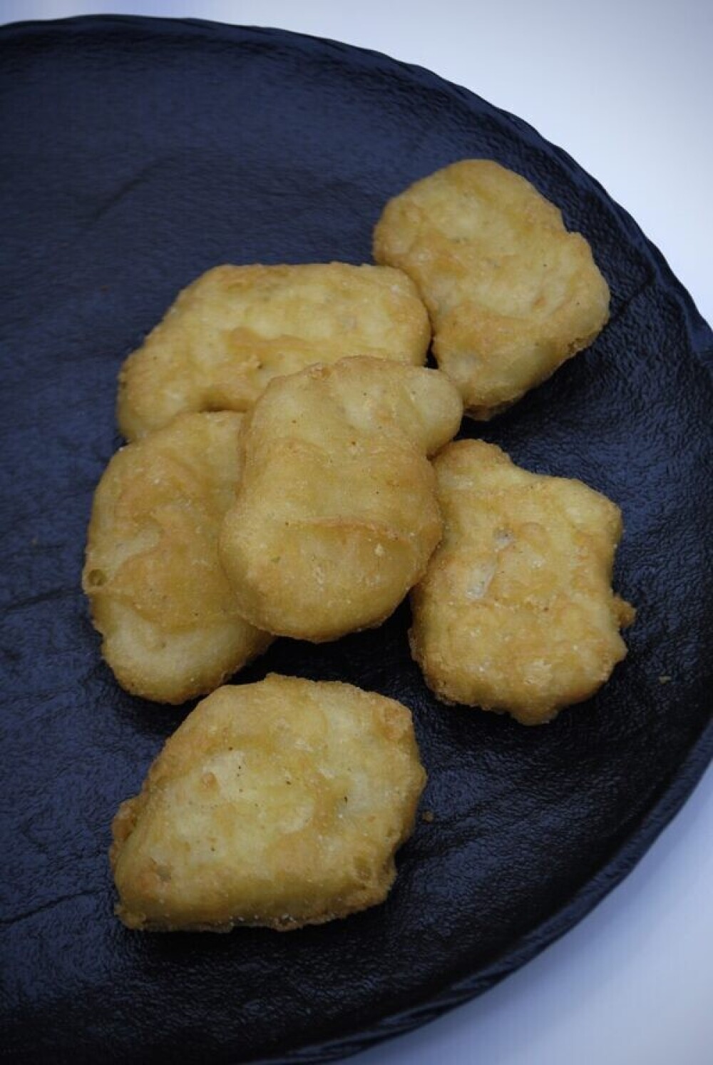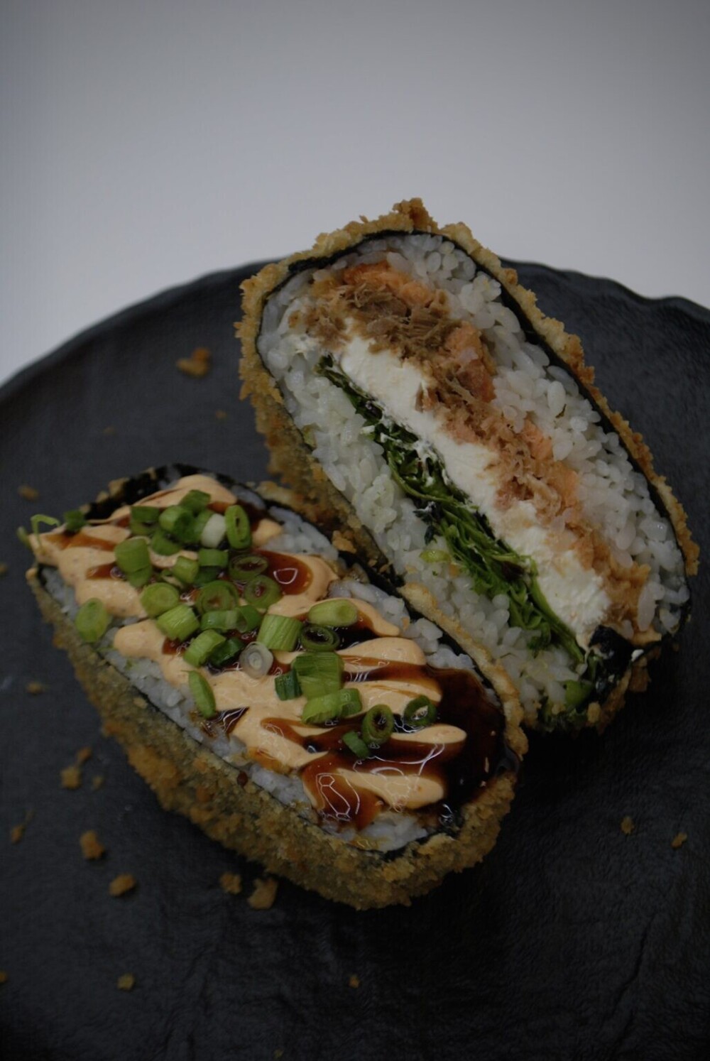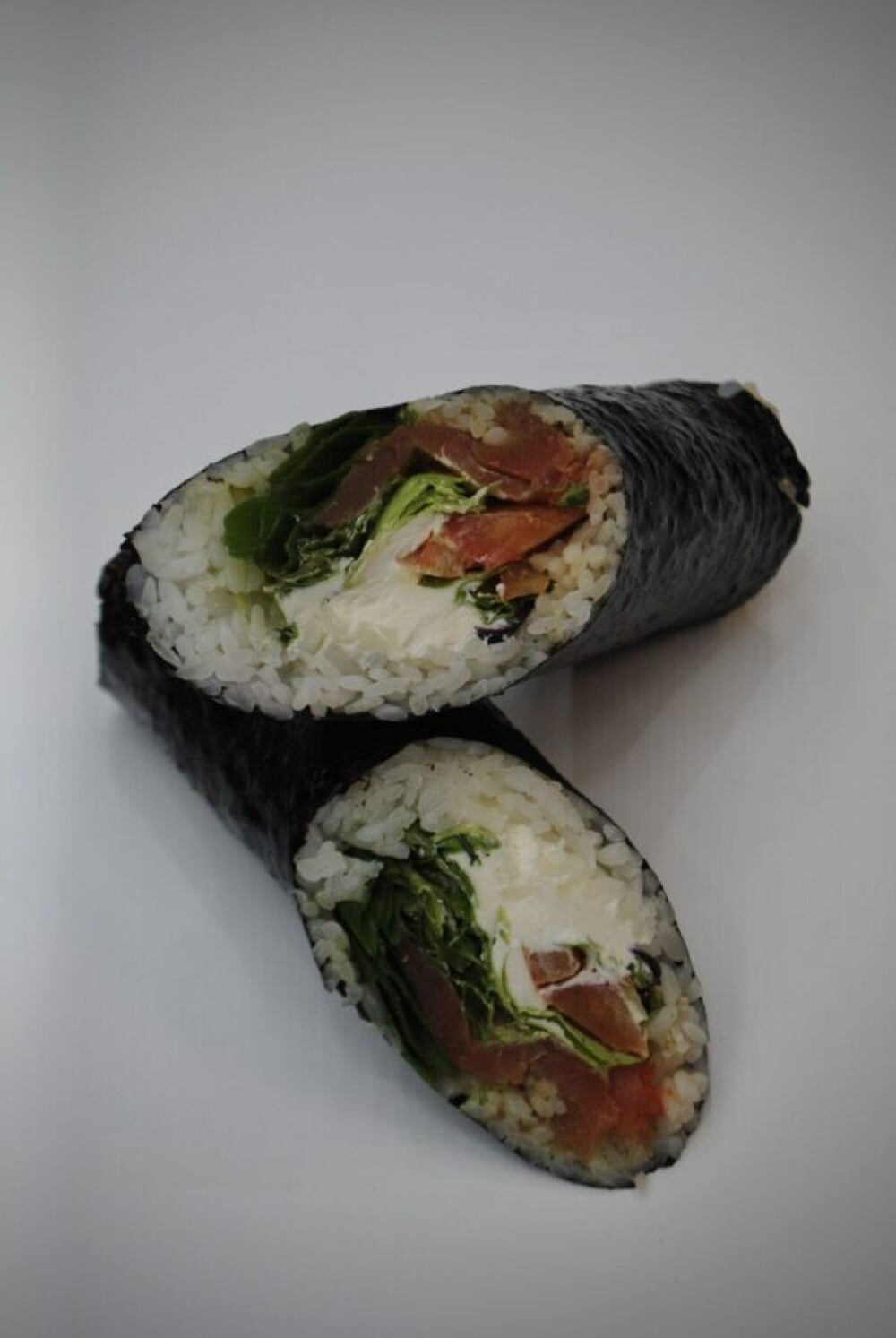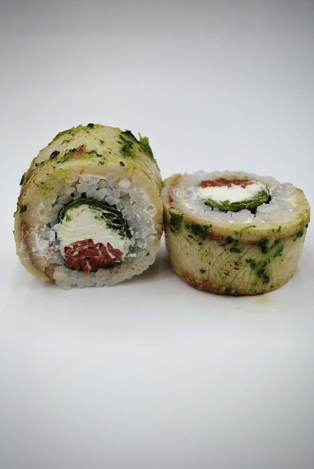 Рис, водоросли «Нори», микс салата, соус «Зеленый», помидоры, цыпленок «Су-вид», сыр «Чеддер», сыр «Моцарелла», соус «Бургер», панировка «Темпура»