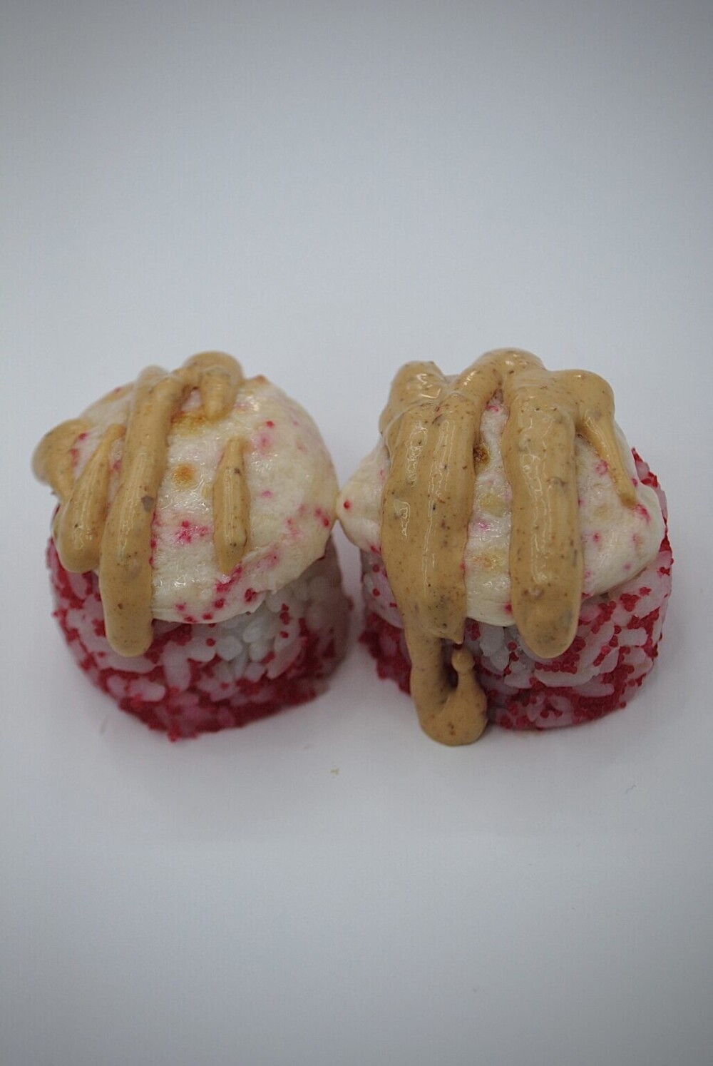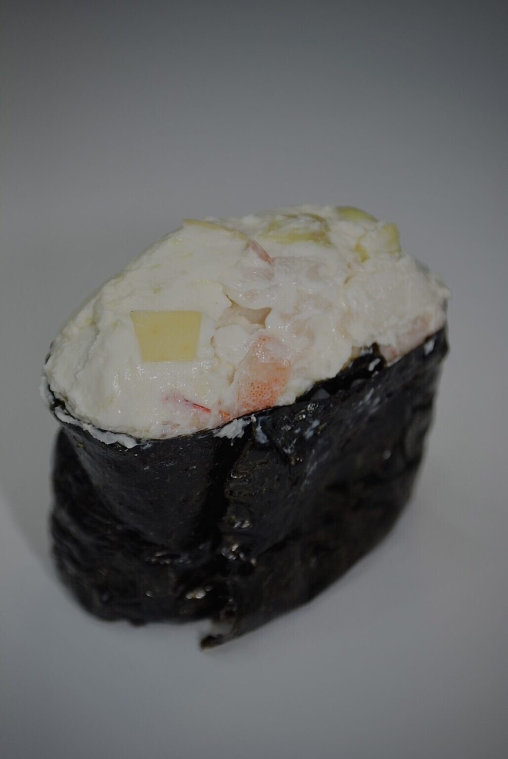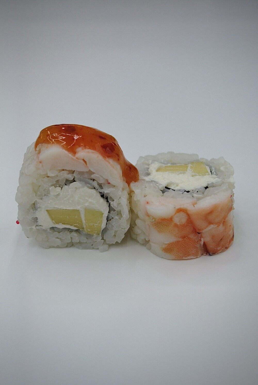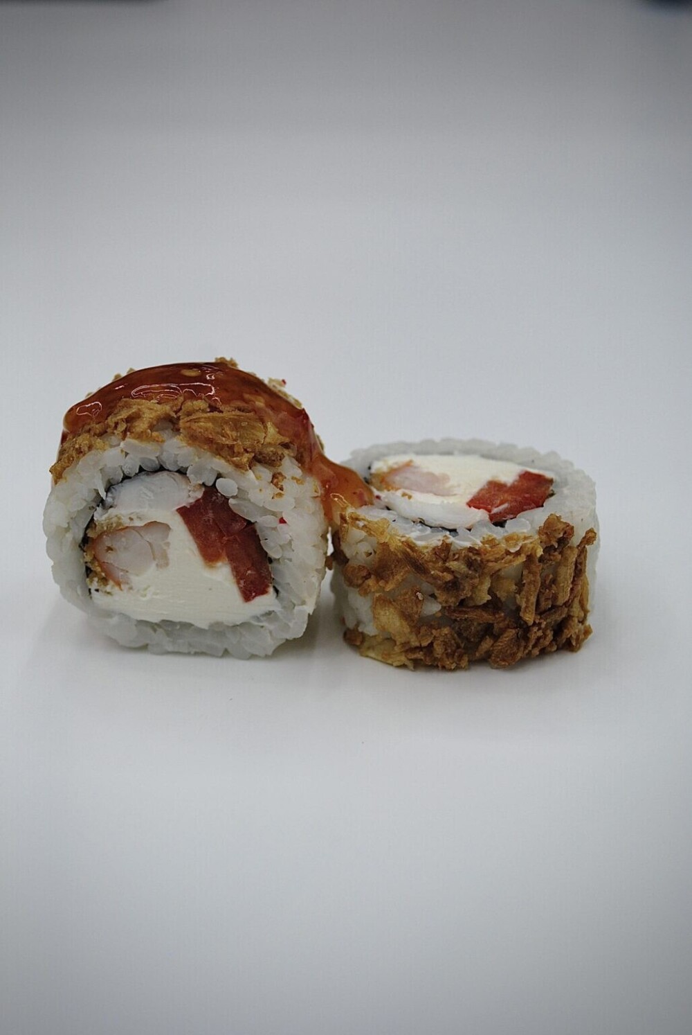 Рис, творожный сыр, перец сладкий, креветка «Темпура», микс салата, соус «Чили сладкий», соус «Ореховый»