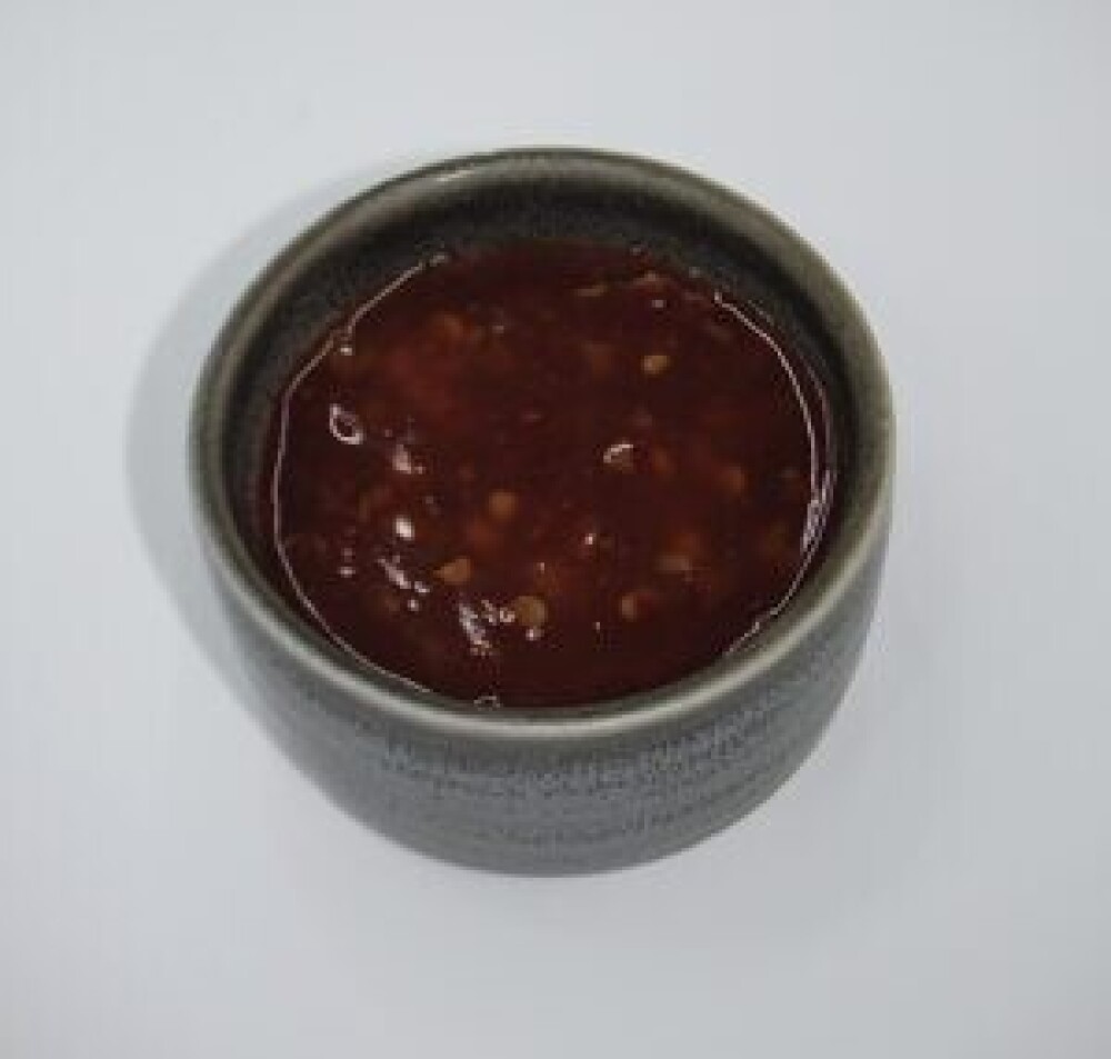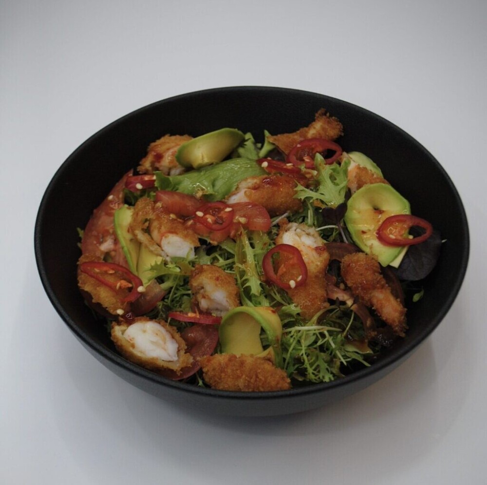 Салатный микс, помидоры, авокадо, креветка « темпура», соус «Чили сладкий», перец  «Чили»
