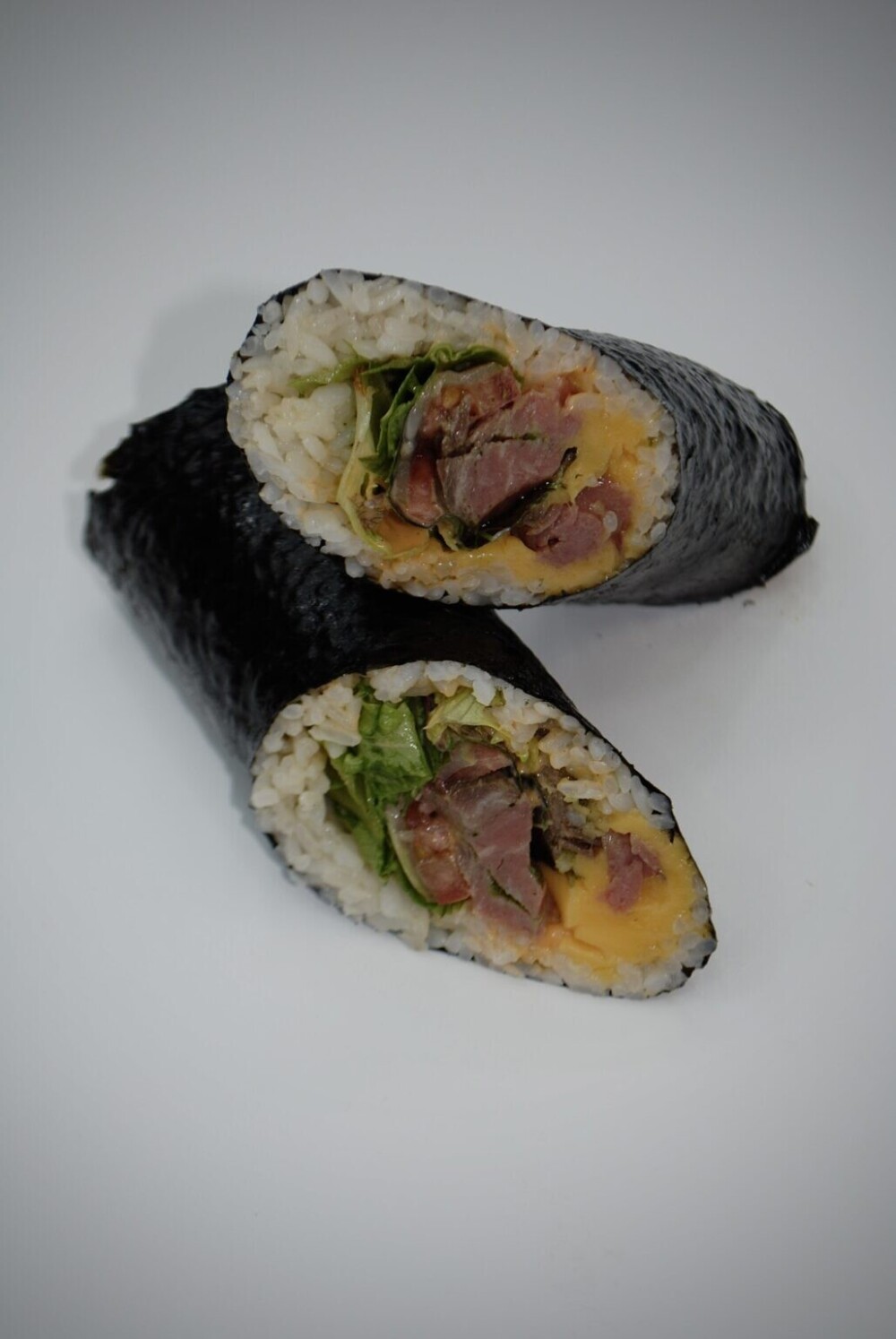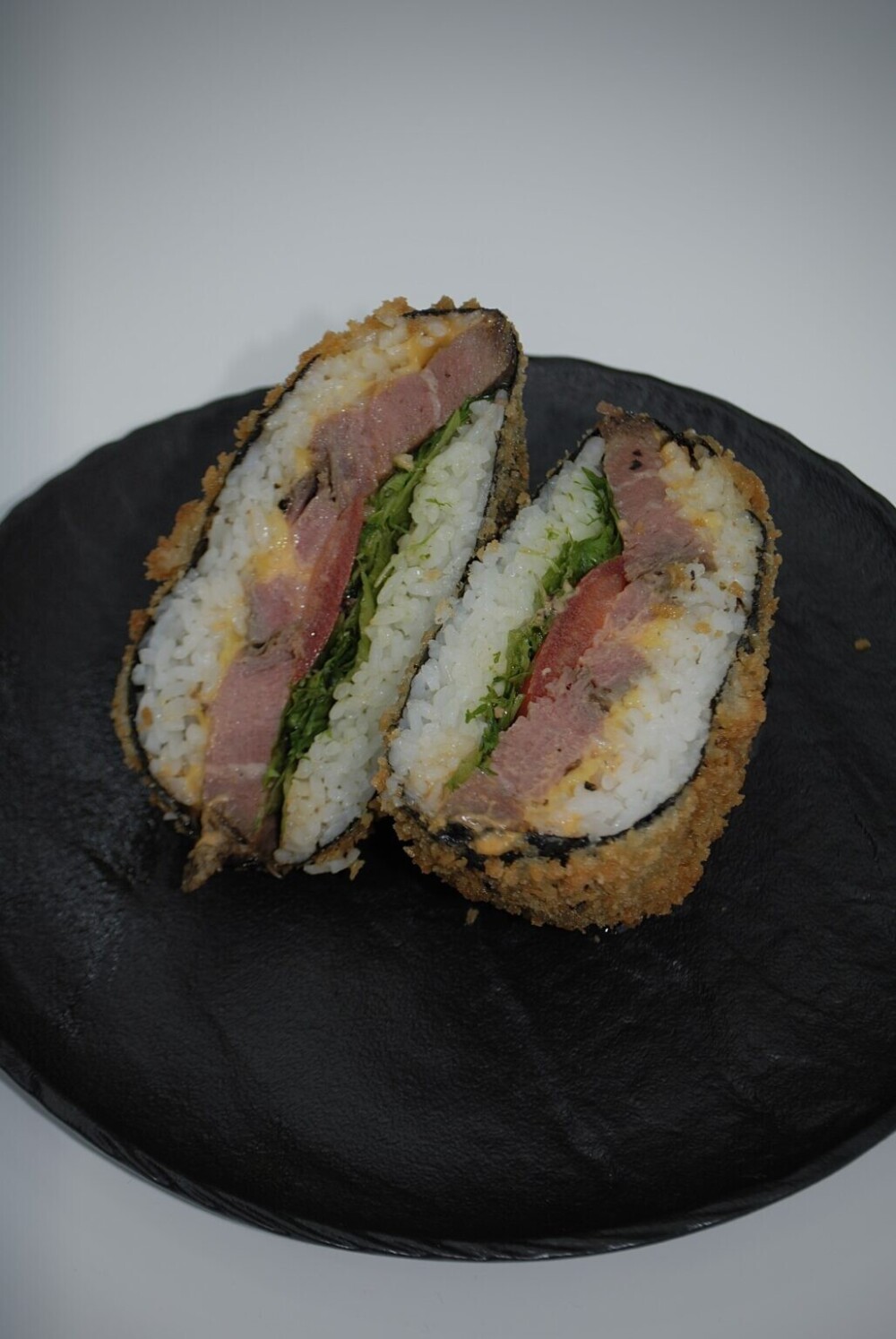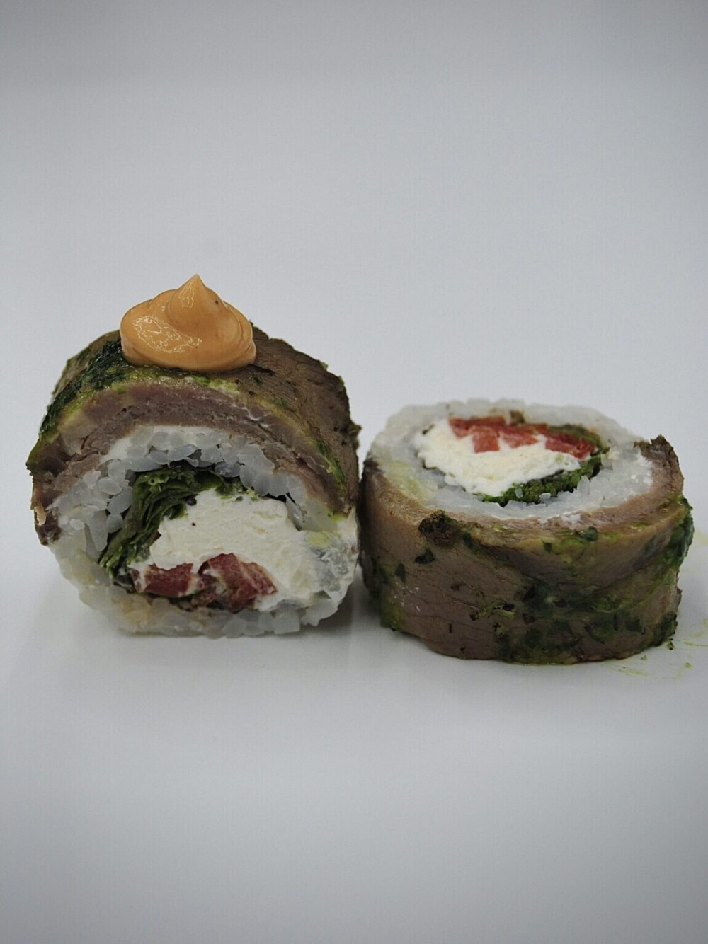 Рис, водоросли «Нори», микс салата, соус «Зеленый», помидоры, вырезка говяжья, сыр «Чеддер», сыр «Моцарелла», соус «Бургер», панировка «Темпура»
