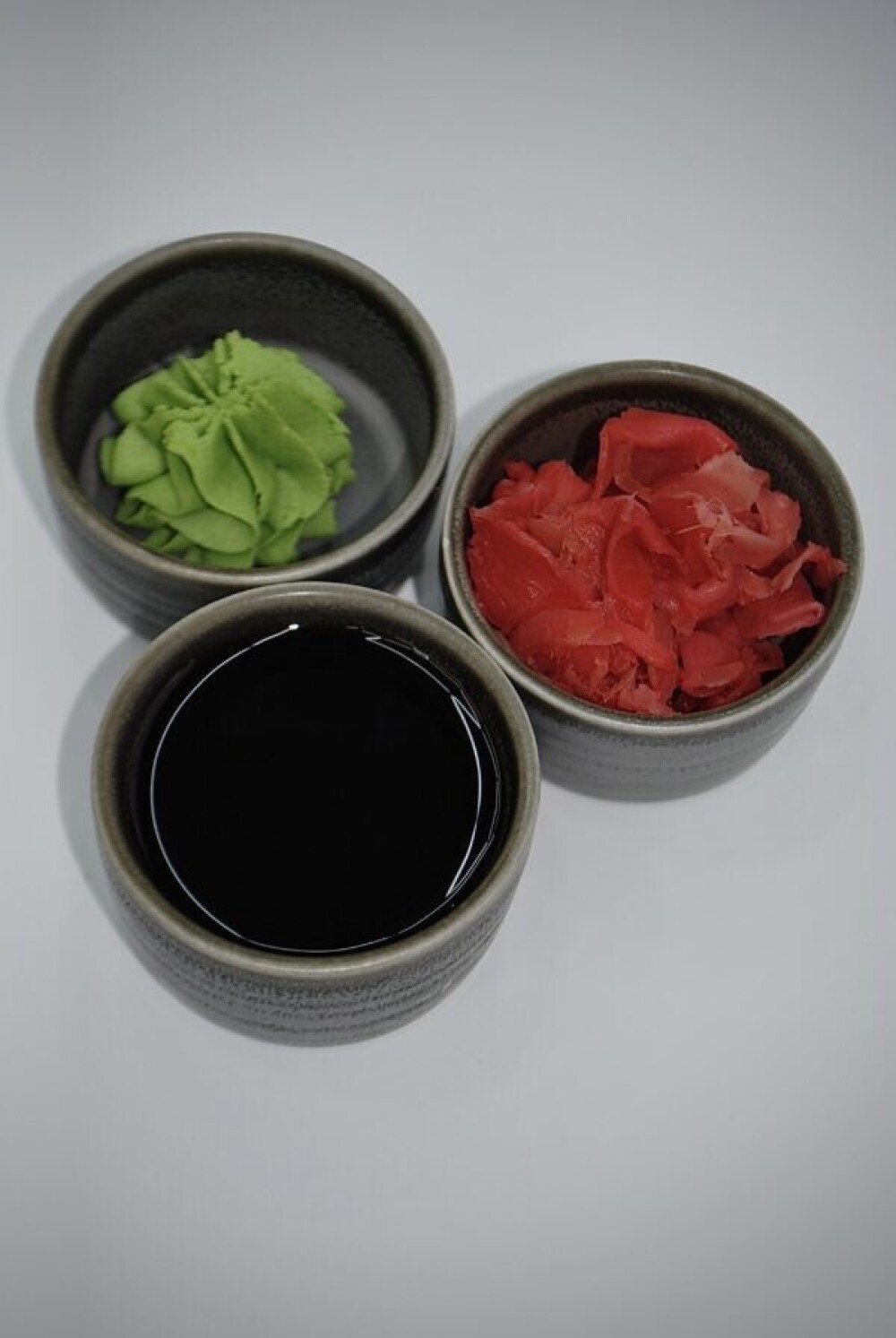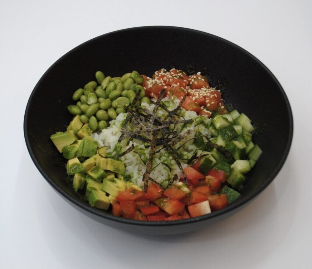 Рис, авокадо, бобы «Эдамамэ» , огурец свежий, перец сладкий, лосось свежий, водоросли «Нори», кунжут, соус «Зеленый» , соевый соус