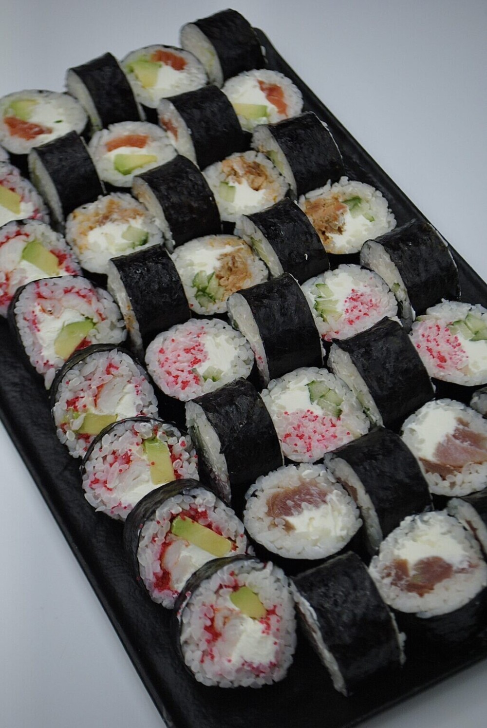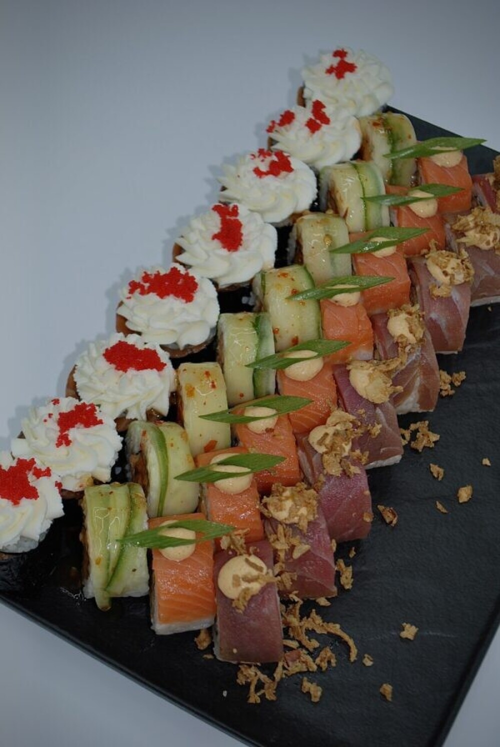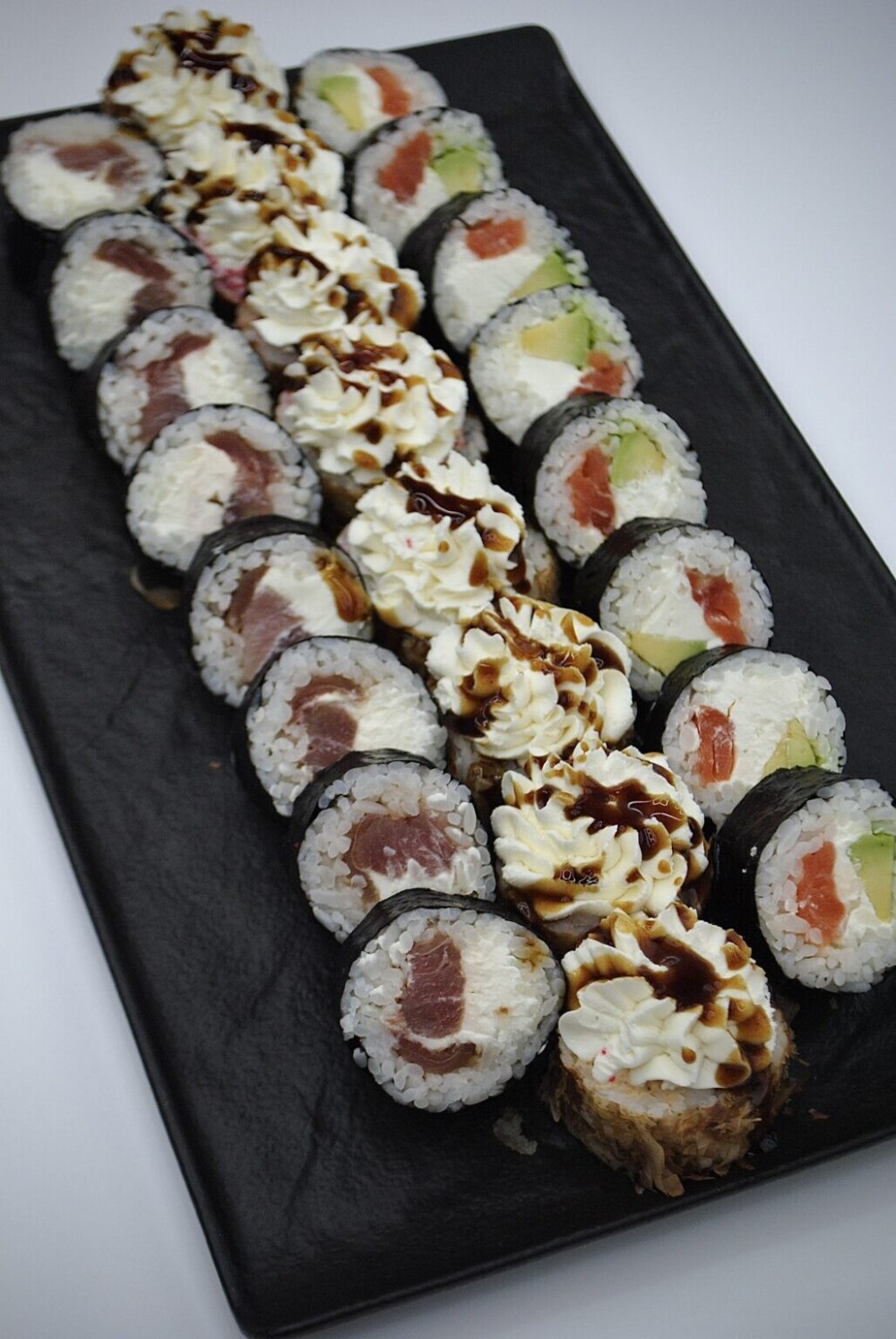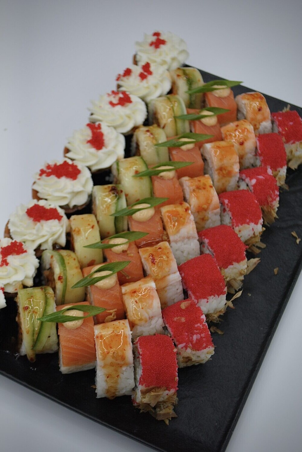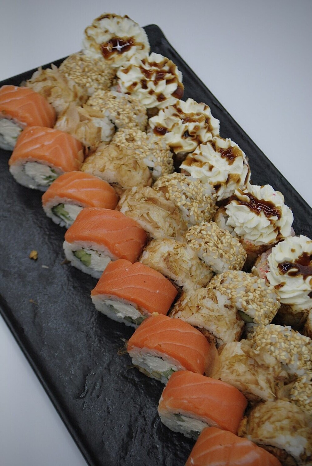 Ролл «Кумамото маки» (Микс салата , тунец свежий, творожный сыр, перец сладкий, лук жареный, соус «Спайси» ), ролл «Оригами маки» (Салат «Чука», «Ореховый» соус, лосось свежий, сыр творожный, икра «Обико»т), ролл «Гавайи маки» (Сыр творожный, омлет «Тамаго» , креветка «Темпура», огурец свежий, соус «Чили сладкий» ), ролл «Юки маки» (Творожный сыр, креветка «Темпура» , лосось соленый, огурец свежий, снежный краб, икра «Тобико», майонез, соус «спайси,» лук зеленый)