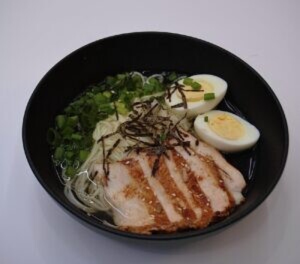 Лапша «Яичная», бульон куриный, цыпленок «су-вид», яйцо отварное, лук зеленый, водоросли нори, кунжут