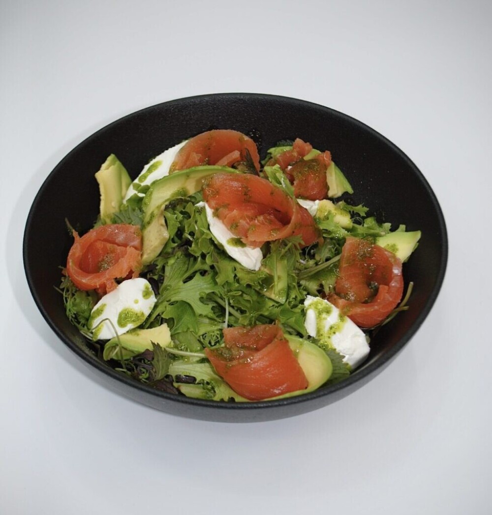 Салатный микс, авокадо, лосось соленый, творожный сыр, соус « зеленый»