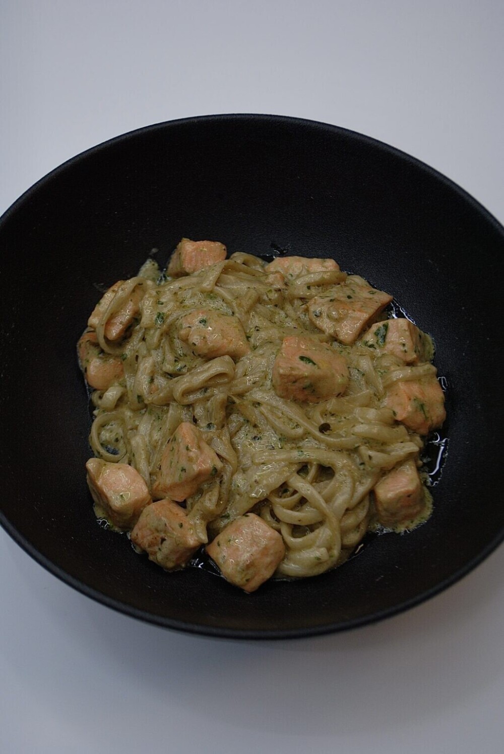 Лапша «Удон», филе лосося, чесночное масло, сливки, соевый соус.