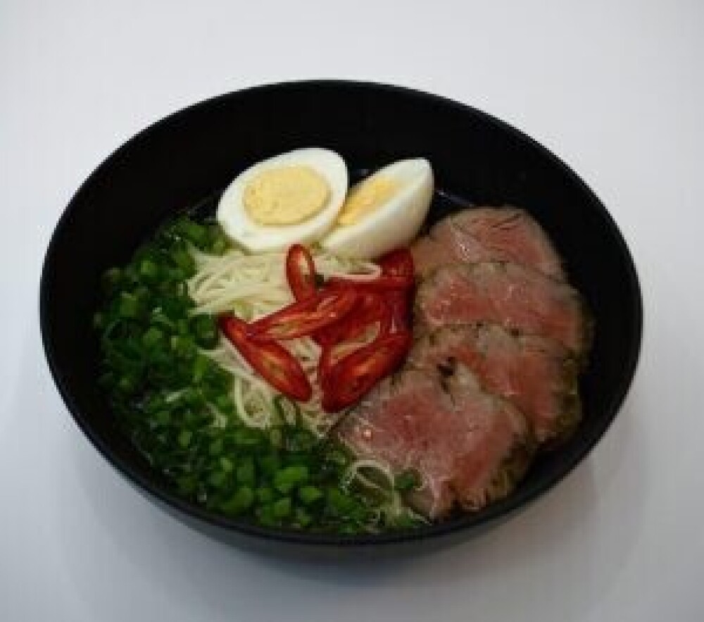 Лапша «Яичная», бульон куриный, говядина «су-вид», яйцо отварное, лук зеленый, перец чили