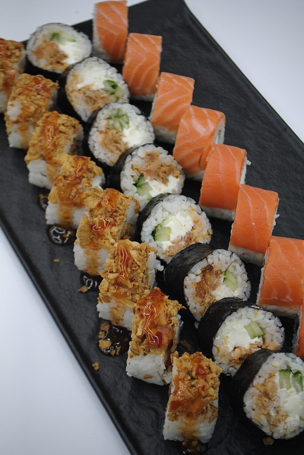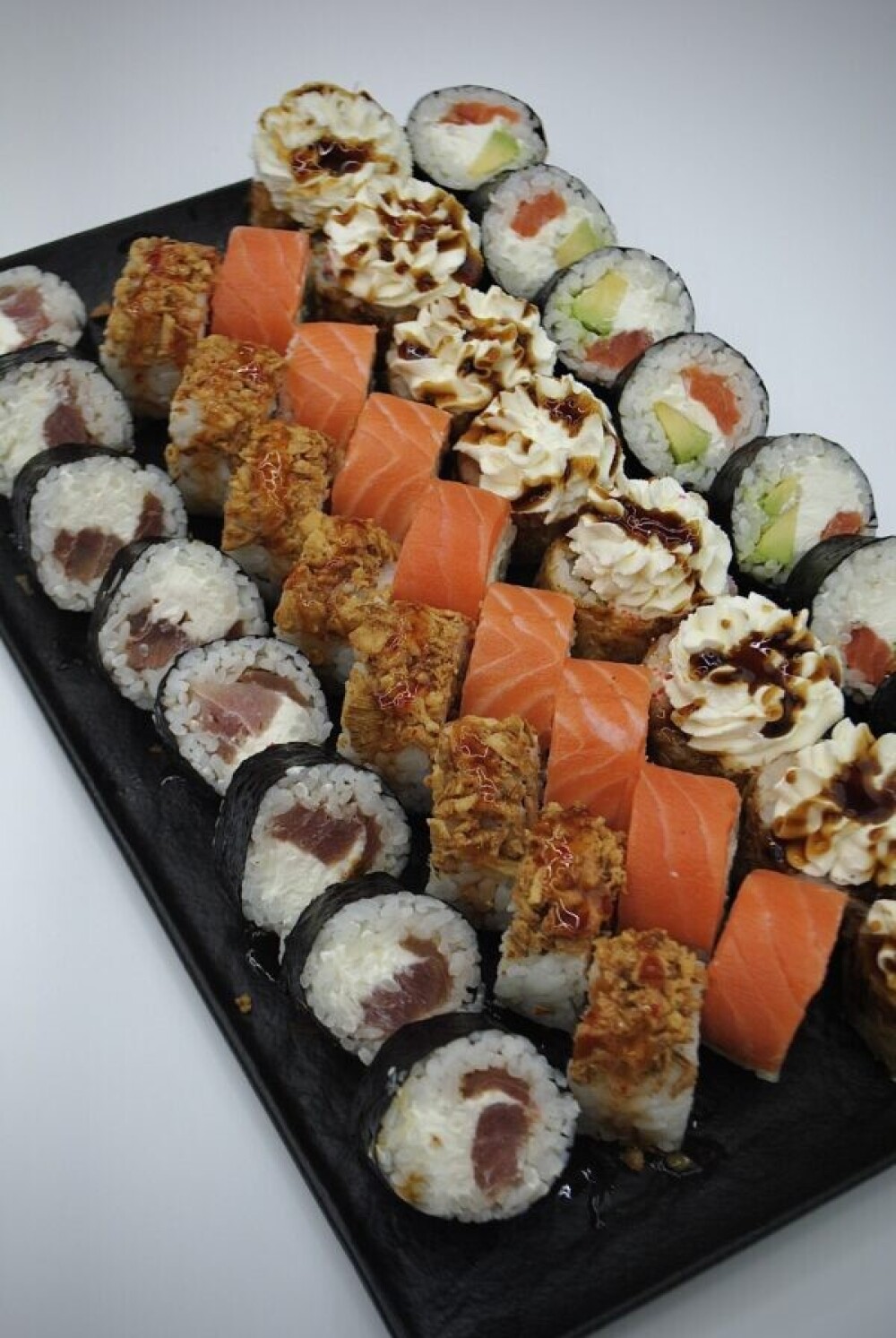Ролл «Сяке авокадо» (Творожный сыр, лосось свежий, авокадо), ролл «Конан маки», (Творожный сыр, креветка «Темпура,» перец сладкий, жареный лук, соус «Сладкий Чили»), ролл «Филадельфия лайт», (Сыр творожный, огурец свежий, лосось свежий), ролл «Ясай маки», (Снежный краб, икра тобико, майонез, «Спайси» соус, огурец свежий, сыр творожный, соус «Терияки»), ролл «Текка нори» (Творожный сыр, тунец свежий)
