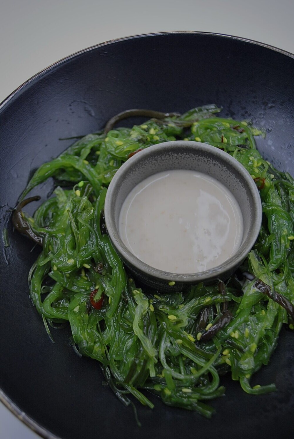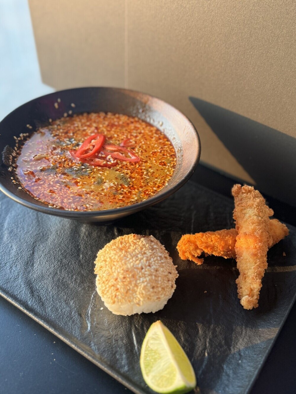 Бульон куриный, имбирь, молоко кокосовое, свежий перец чили, лемонграсс, цыпленок «Су-вид», помидоры «черри» , шампиньоны, водоросли нори, рис, кунжут, лайм