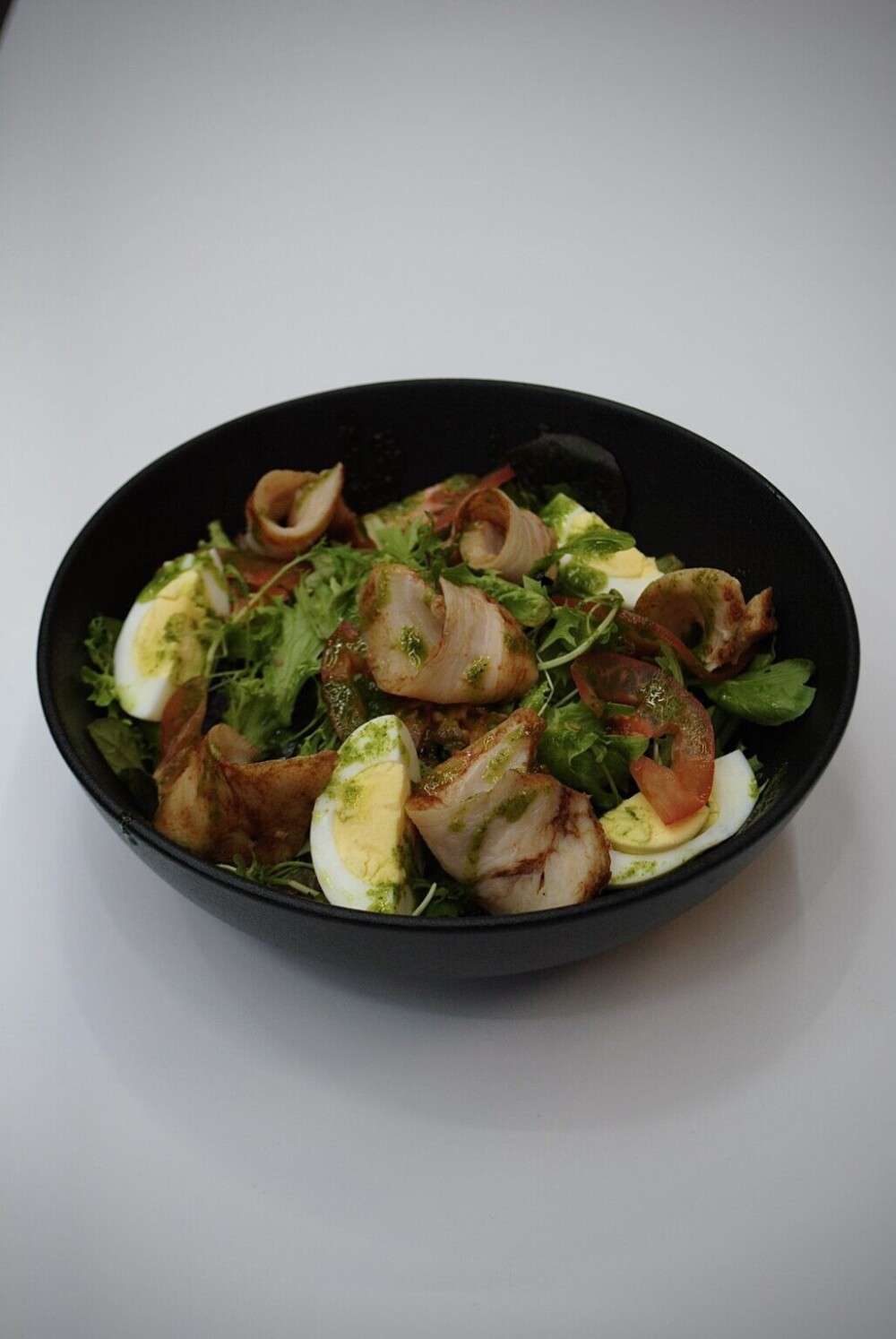 Салатный микс, помидоры, цыпленок «Су-вид», яйцо отварное, соус «Зеленый»