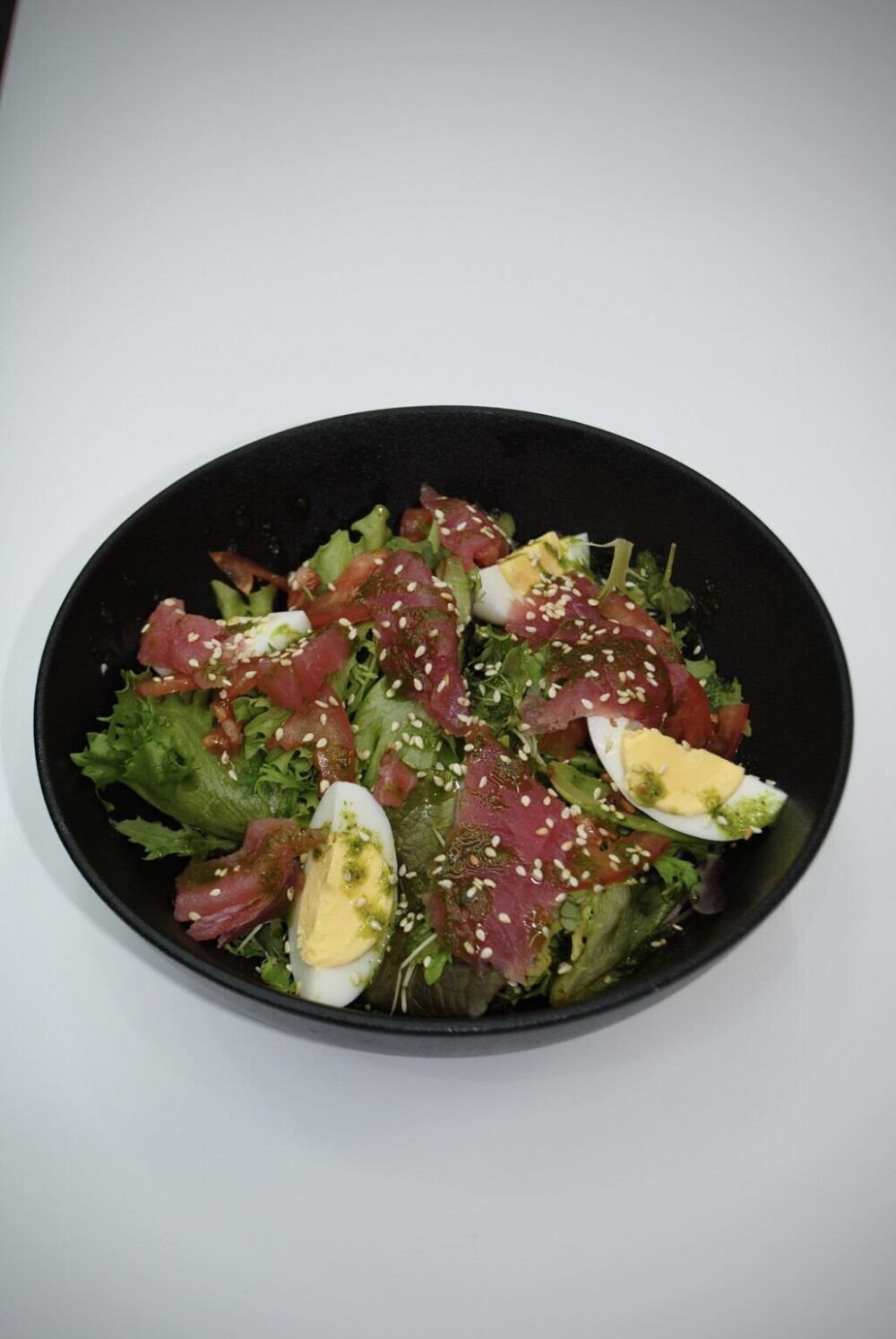 Салатный микс, помидоры, яйцо отварное, тунец свежий, соус « зеленый»