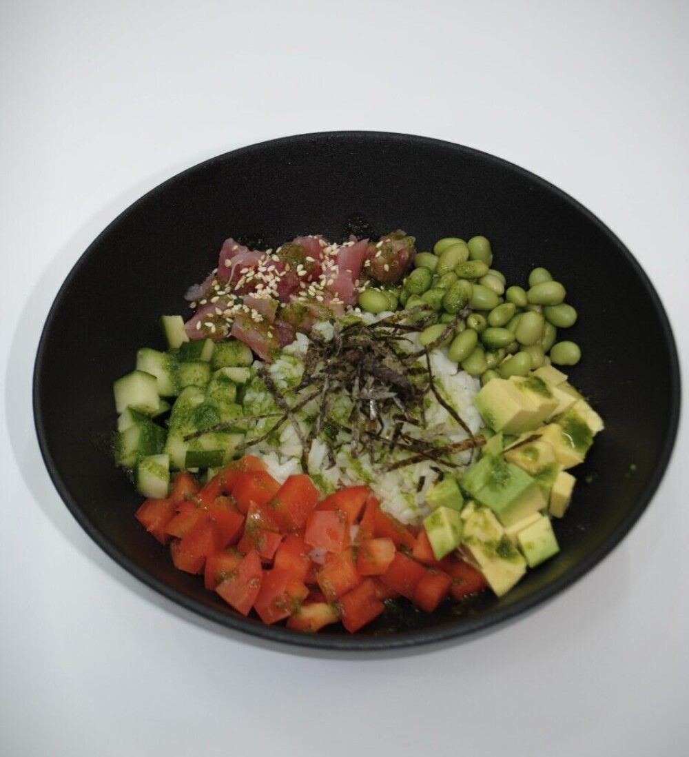 Рис, авокадо, бобы «Эдамамэ» , огурец свежий, перец сладкий, тунец свежий, водоросли «Нори» , кунжут, соус «Зеленый», соевый соус