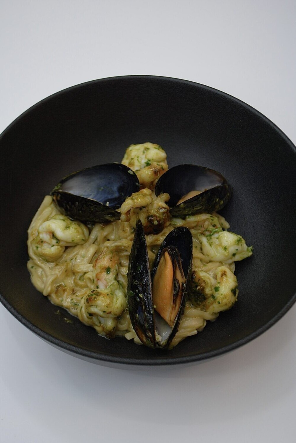 Лапша «Удон» , мидии, креветки, масло чесночное, сливки, соус «Устричный»
