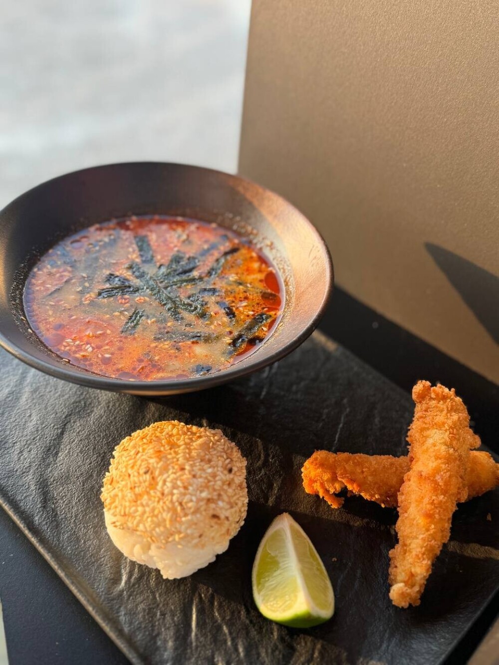 Бульон куриный, имбирь, молоко кокосовое, свежий перец чили, лемонграсс, помидоры «черри», мидии, шампиньоны, водоросли нори, креветки «Темпура» , рис, кунжут, лайм