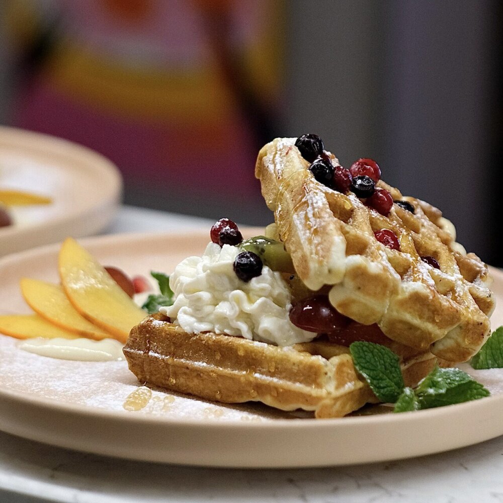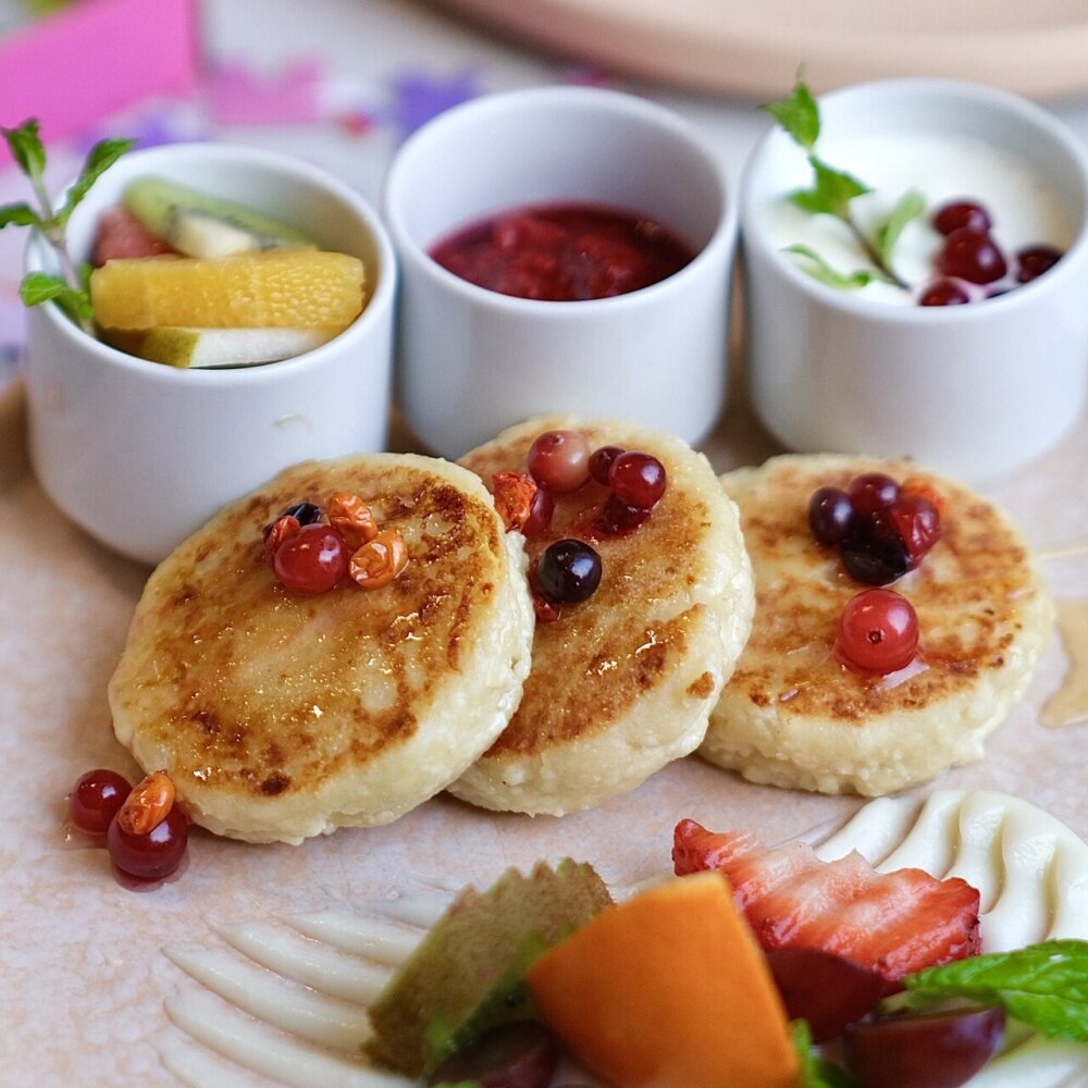 Перетёртые ягоды, фруктовый салат, сметана, мёд