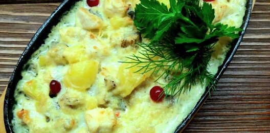 Гратен с курицей, грибами и сырным соусом