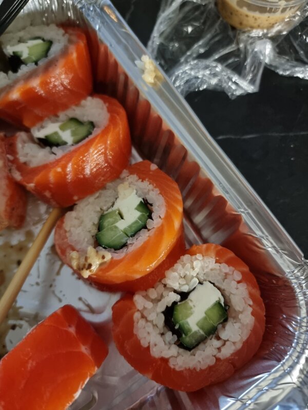 Роллы вкусные, рыбы в филадельфии было предостаточно, еще и на бутерброды хватило😂 Предоставили ореховый соус и имбирь по просьбе в комментарии. Мне все понравилось, быстро, вкусно, сочно.