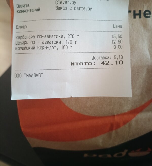 07.01.26 сделал заказ в Pad hai на самовывоз в ТЦ «Атриум», г.Могилёв. В заказе было 2 комбо: 1. «супер-комбо», в состав которого входит рамен с курицей + курица в соусе терияки с лапшой удон, а также 2. «сеул комбо», в состав которого входит сырный рамен + орандж чикен. Заказ был получен, однако на месте был не проверен, так как он был запечатан на степплер. Открыв заказ дома оказалось, что заказ не соответствует, поскольку вместо «Оранж чикен», в заказе «курица в соусе терияки с лапшой удон». Об отсутствии в меню блюда «Оранж чикен» при подтверждении заказа никто не предупреждал