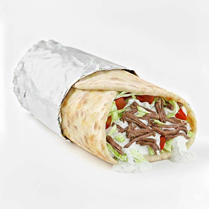 Тортилья, соус чесночный, рваная говядина, томат, сыр моцарелла, сыр чеддер, салат айсберг.