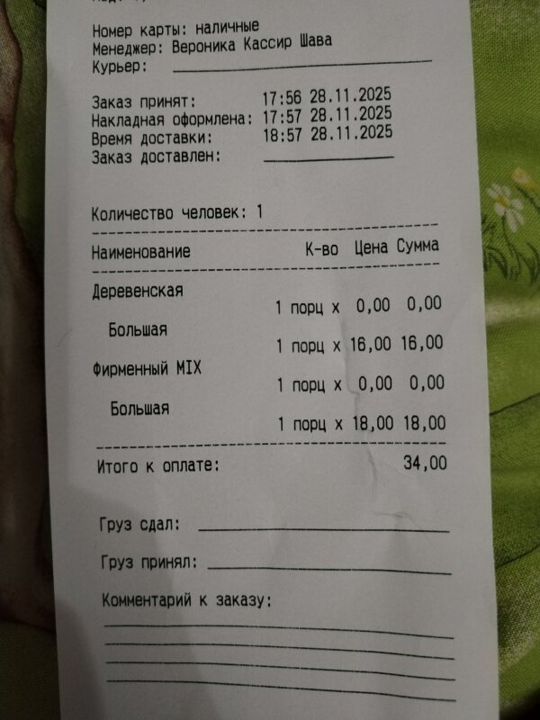 Все понравилось:вежливый курьер,вкусная еда,доступные цены)))