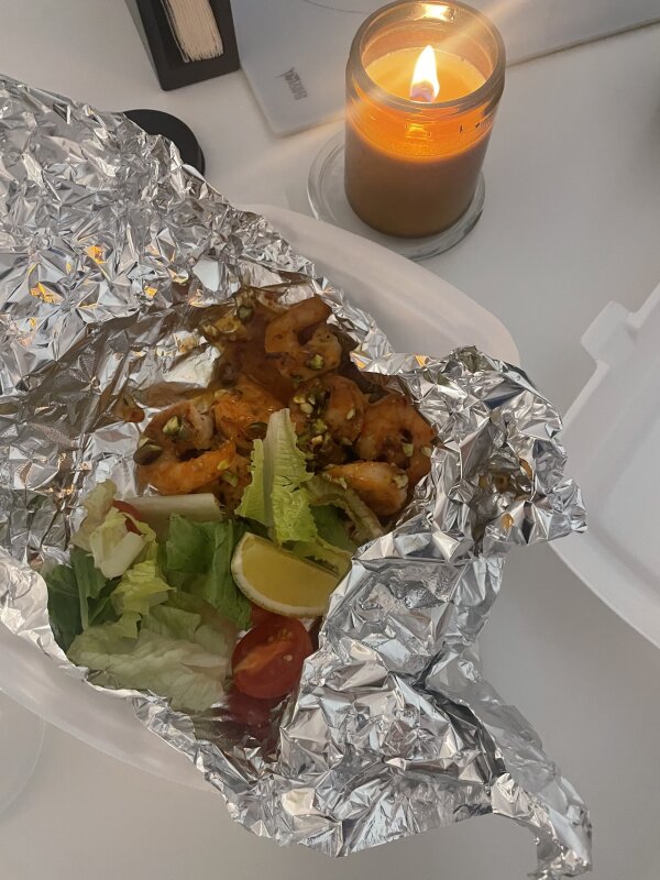 Заказ хорошо упакован, приехал тёплый, привезли меньше, чем за час. Порции большие. Еда вкусная, но не 5 звёзд (это на мой личный вкус). Боул с креветками громко сказанно, потому что там креветок немного, но там много и не надо, просто заказывали вслепую, когда читаешь название представляешь тарелку креветок. Каше и редиске там ставлю 10/10, божественно и сытно. Рёбрышки свиные жирненькие, поэтому хорошо, что там зелень есть и фасоль стручковая.