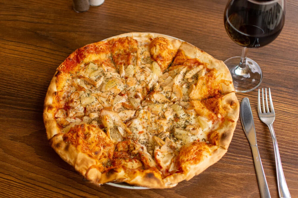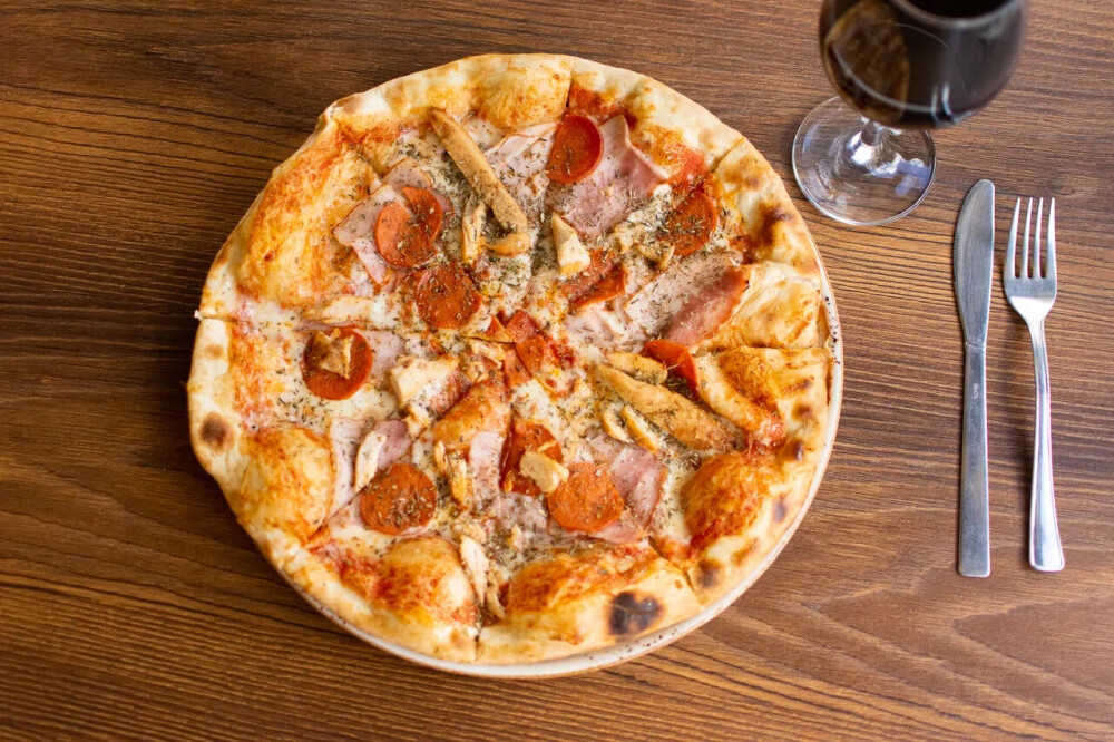 Тесто, соус «Пелати», сыр «Моцарелла», пепперони, ветчина, бекон, филе цыпленка, специи