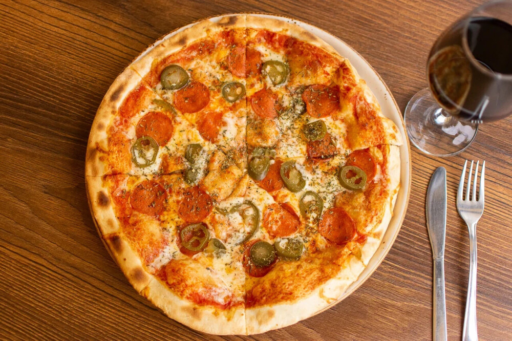 Тесто, соус «Пелати», сыр «Моцарелла», колбаса «Чоризо», халапеньо, чили, специи
