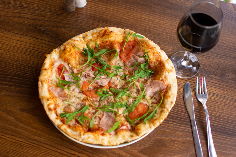 Тесто, соус «Пелати», сыр «Моцарелла», ветчина сыровяленая, помидоры, рукола, специи