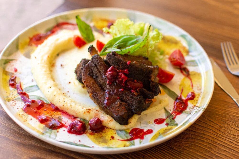 Свиные ребра в вишневой карамели с копченым картофельным кремом