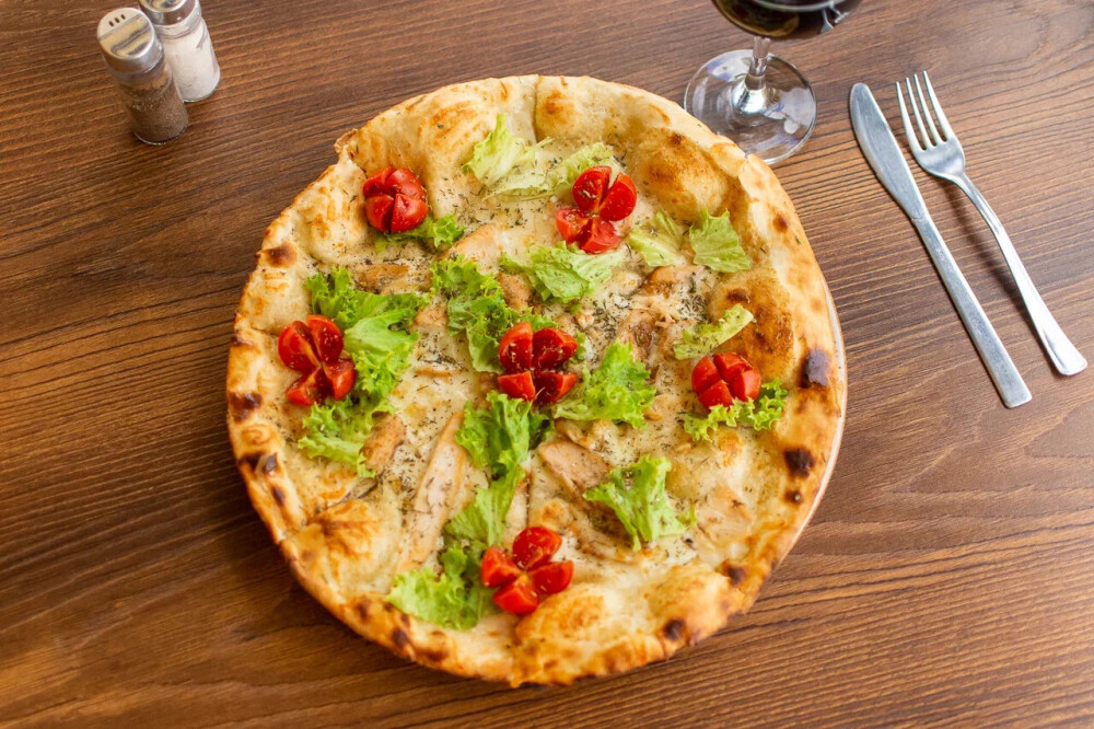 Тесто, соус «Цезарь», сыр «Моцарелла», филе цыплёнка, бекон, яйцо перепелиное, лист салатный, черри, сыр «Пармезан», специи